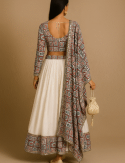 This elegant three-piece lehenga set features a richly embroidered long-sleeve blouse, a flowy ivory flared skirt, and a matching dupatta. The blouse and dupatta are adorned with intricate multicoloured geometric motifs in red, green, and gold, while the skirt adds balance with its soft, solid tone and a heavily embroidered hemline. A perfect blend of tradition and subtlety, this ensemble offers a regal look for special occasions.