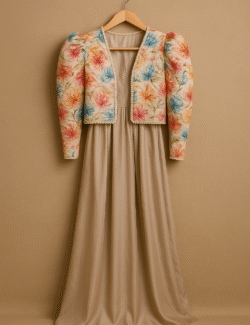A graceful full-length beige gown paired with a striking multicolour floral jacket. The cropped jacket features statement puffed sleeves and a charming pastel flower print, finished with pearl lace edging. This stylish two-piece outfit combines classic elegance with playful flair, making it ideal for festive and semi-formal occasions.