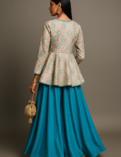 An elegant Indo-western ensemble featuring a brocade peplum top with delicate motifs, paired with a teal flared skirt. The set is completed with a matching embellished potli bag and traditional juttis, creating a regal festive look.