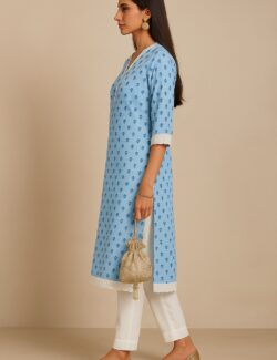 AÂ relaxed and breezy blue floral kaftan-style kurti crafted for everyday comfort with timeless charm. Highlighted by delicate lace on the neckline, cuffs, and hemline, this piece blends tradition with simplicity.