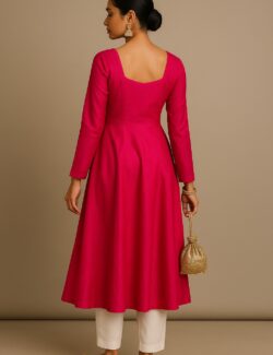 This vibrant fuchsia pink kurti features a subtle tie-dye pattern with white piping along the princess lines, adding structure and elegance. Designed with a round neckline, three-quarter sleeves, and an asymmetrical hemline, it offers a contemporary touch to a traditional silhouette. A keyhole back with tie-up detail adds a charming finish.