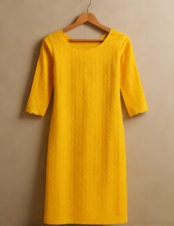 This mustard yellow kurti blends festive elegance with everyday sophistication, featuring minimal embroidery texture and a clean, straight silhouette. Finished with a scalloped hem and 3/4 sleeves, it’s perfect for ethnic gatherings and smart daytime wear.