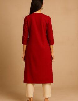 A sophisticated straight-cut kurti in a soothing aqua-blue hue, adorned with vertical maroon Lace detailing and handcrafted buttons for a refined ethnic look. Designed for effortless comfort and timeless appeal.