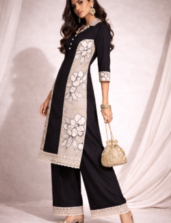 A sophisticated kurti crafted with a striking contrast of solid black and soft floral prints. Designed with a structured silhouette and delicate lace detailing, this kurti blends modern tailoring with timeless Indian aesthetics. Perfect for women who appreciate understated elegance with a contemporary touch
