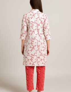 A charming and vibrant kurta set that pairs a white kurta with delicate red floral prints and a contrast red bandhani-style printed pant. The combination of traditional patterns and contemporary silhouette makes it both playful and graceful.