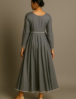 A graceful full-length Anarkali kurta in a lustrous charcoal grey fabric, featuring a deep V-neckline, buttoned bodice, and elegant white piping accents. With its clean structure, full sleeves, and dramatic flare, this piece balances traditional elegance with contemporary finesse.