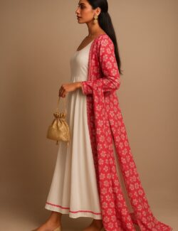 Elegant and graceful, this ivory Anarkali kurta set features a flared silhouette with a classic scoop neckline and full sleeves. It comes paired with a contrasting red printed dupatta, adding a pop of color and ethnic charm to the ensemble.