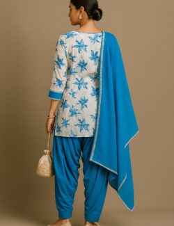 This graceful three-piece salwar suit set features a beige kurta adorned with blue floral embroidery, paired with solid blue salwar pants and a matching blue dupatta. The kurta has a soft V-neckline with three-quarter sleeves and delicate lace edging on the hem and dupatta for a refined touch. Designed for comfort and tradition with a modern aesthetic, it’s perfect for everyday elegance.