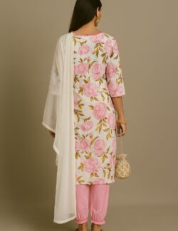 This feminine and refreshing three-piece salwar suit set features a white straight-cut kurta adorned with delicate pink floral prints, paired with a solid pink salwar and a flowy white dupatta. The kurta has a round neckline and three-quarter sleeves trimmed with pink lace for added charm. Lightweight and graceful, this set is perfect for summer festivities and everyday traditional wear.