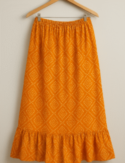 This vibrant Jaipuri skirt in a warm marigold hue is a blend of traditional craft and modern silhouette. With its soft flare and gathered waist, it offers both comfort and ethnic charm. Pair it with a plain shirt or crop top for a chic Indo-western look.