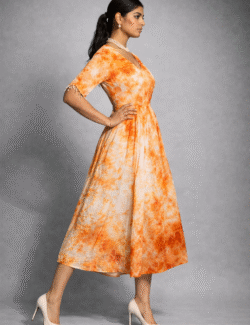 A statement-making midi dress crafted in vibrant amber tie-dye hues, designed to flow effortlessly with every step. Featuring a flattering V-neckline, softly gathered waist, and elegant pearl-tassel sleeve detailing, this dress blends artisanal charm with contemporary sophistication—perfect for confident, modern women.