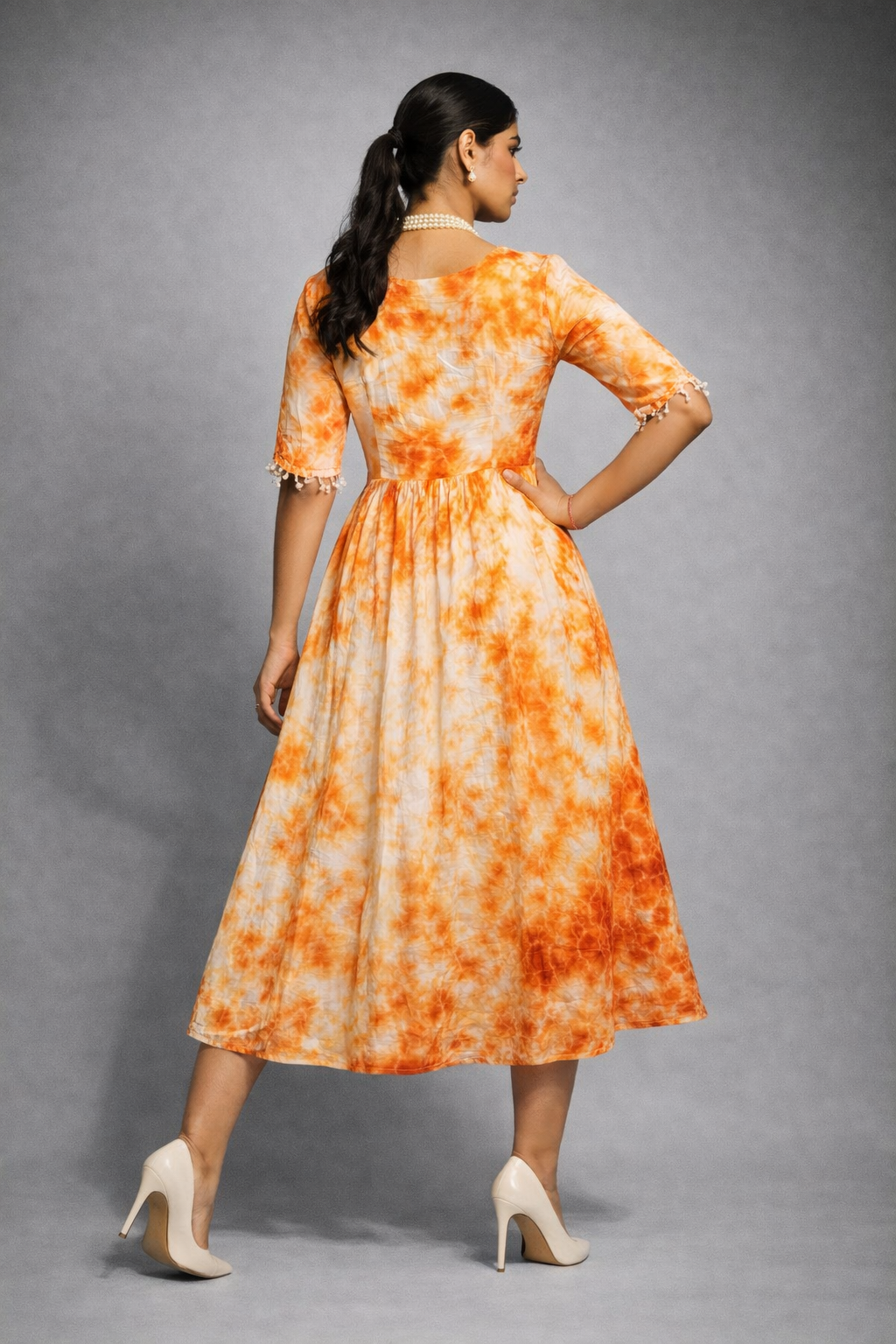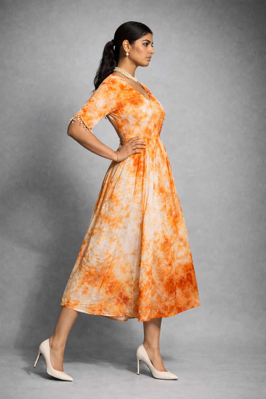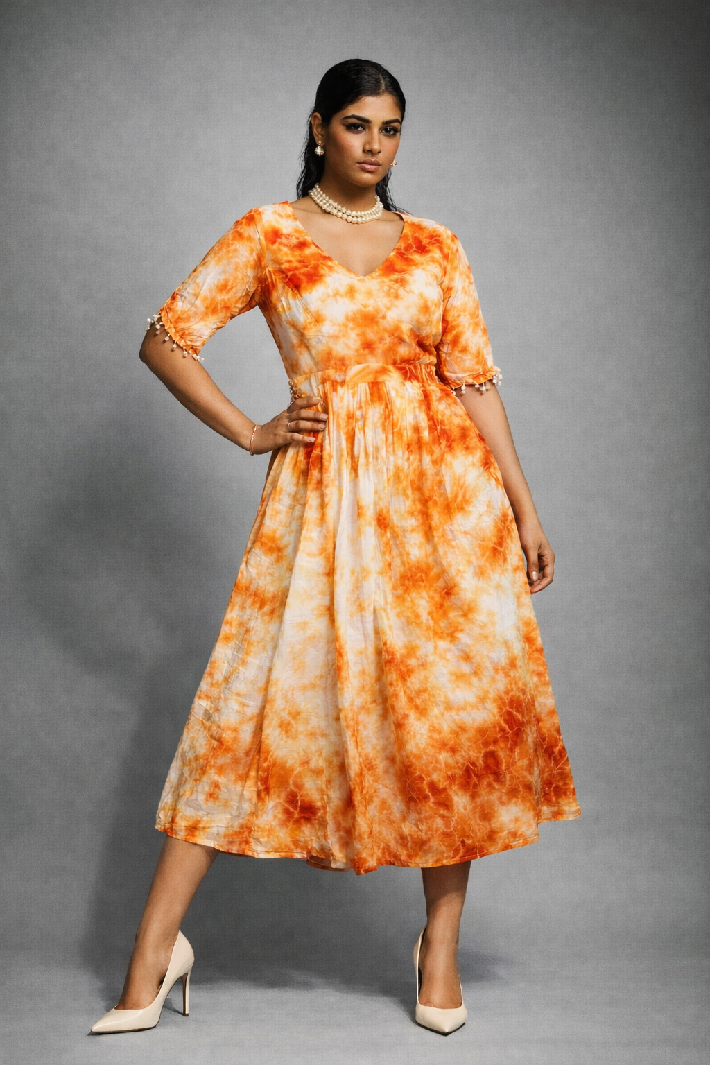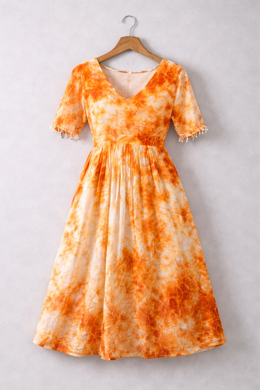 A statement-making midi dress crafted in vibrant amber tie-dye hues, designed to flow effortlessly with every step. Featuring a flattering V-neckline, softly gathered waist, and elegant pearl-tassel sleeve detailing, this dress blends artisanal charm with contemporary sophistication—perfect for confident, modern women.