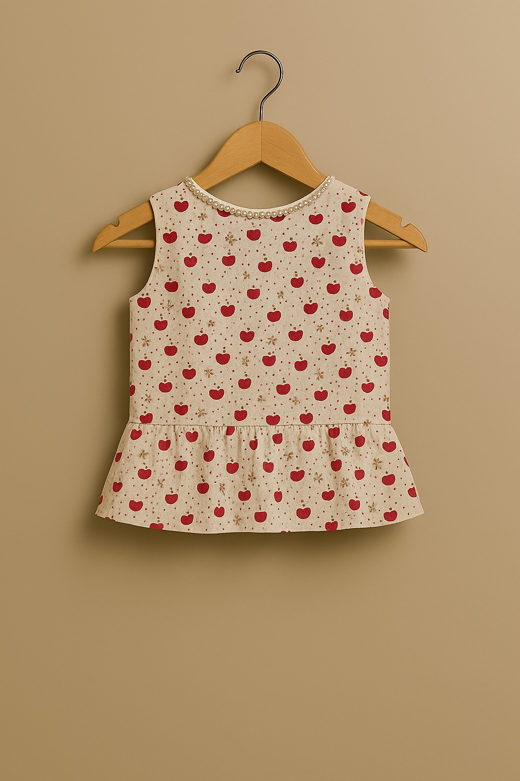 A charming sleeveless peplum top adorned with red apple prints and golden stars. The neckline is embellished with delicate pearl detailing, adding a touch of elegance to this playful design. Perfect for both everyday wear and special outings.