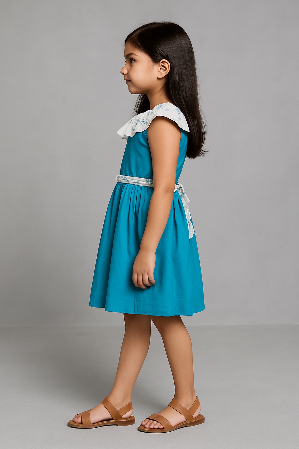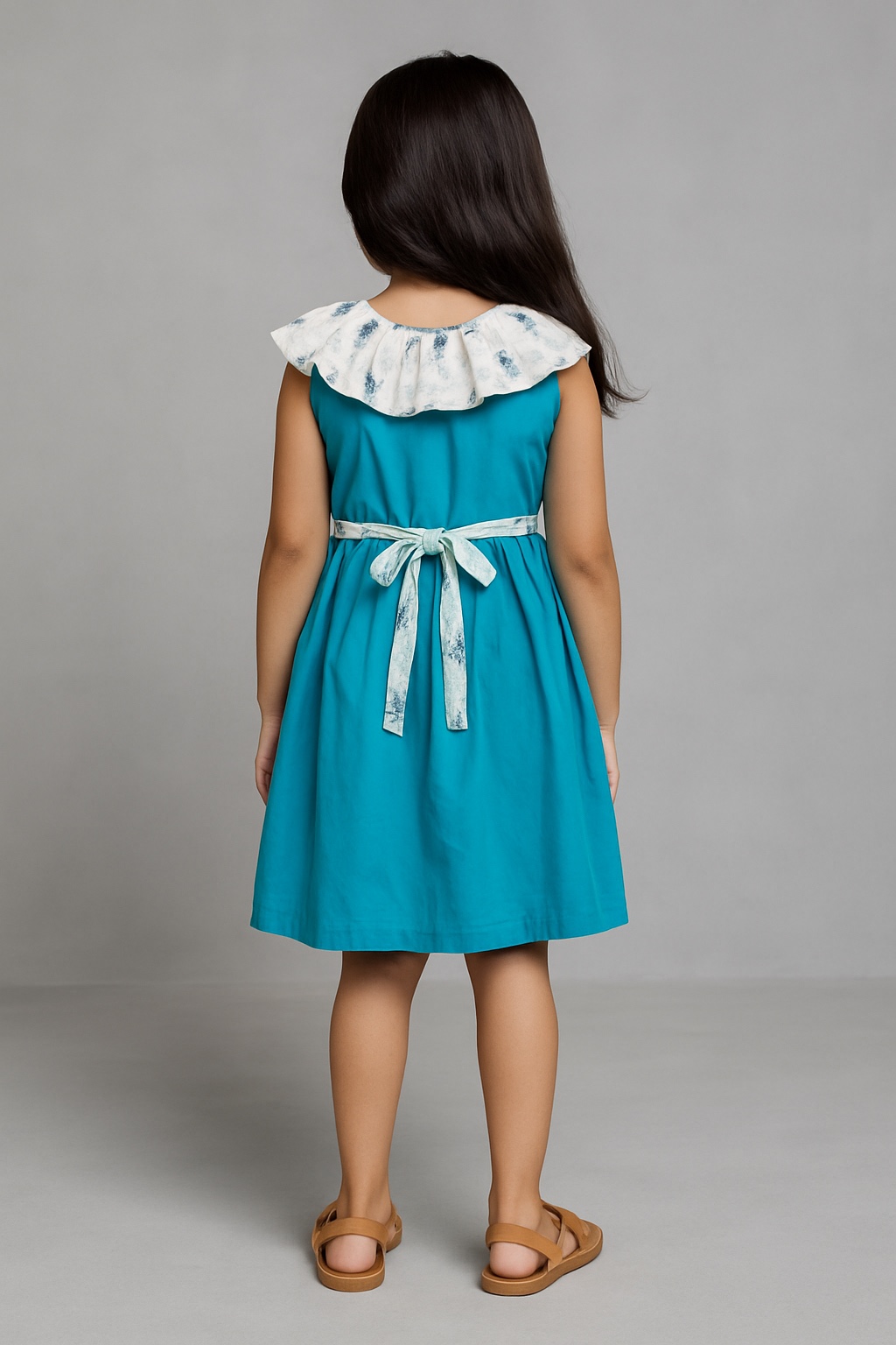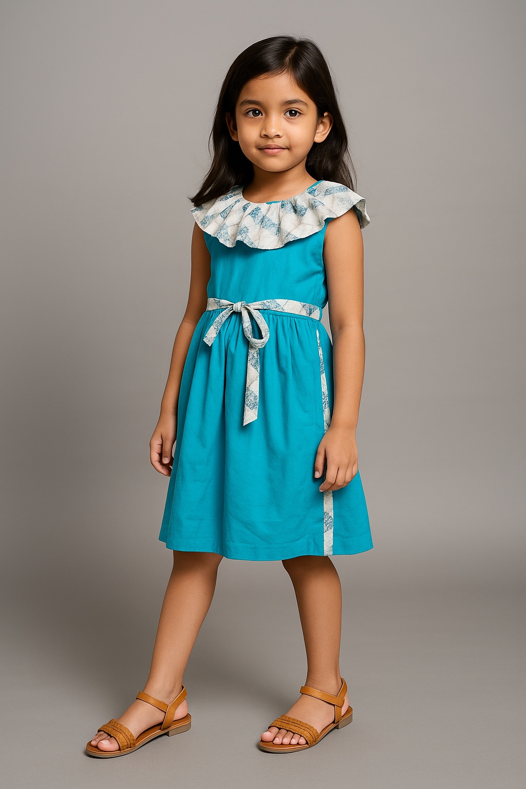 AÂ charming and breathable sleeveless frock for girls, designed in a refreshing aqua blue hue with a contrasting off-white printed ruffle collar and waistband. Perfect for casual outings, summer days, or festive moments with a traditional twist.