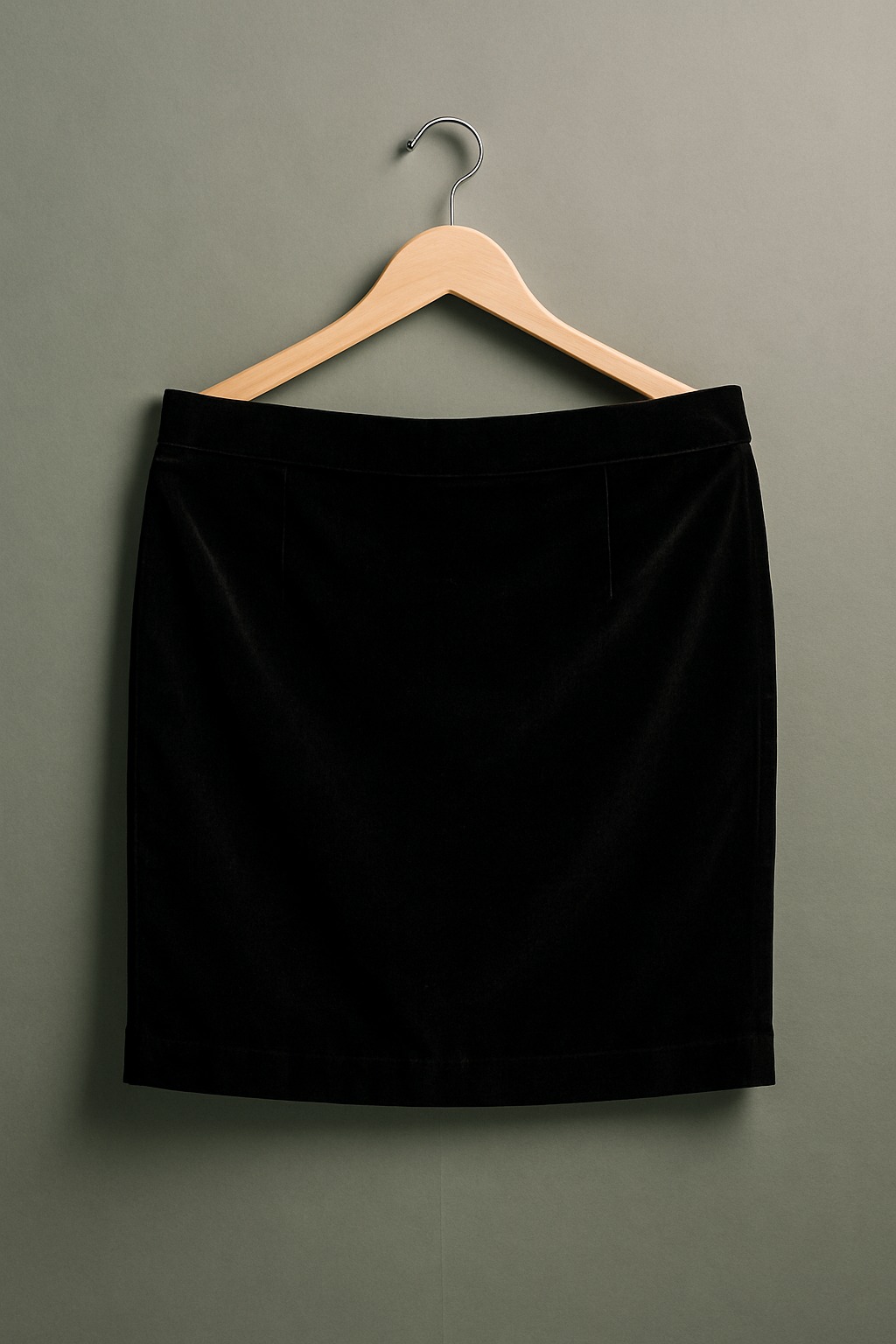 A sleek black velvet pencil skirt designed with a high-rise waistline and a sophisticated silhouette.
