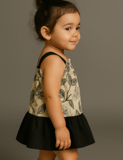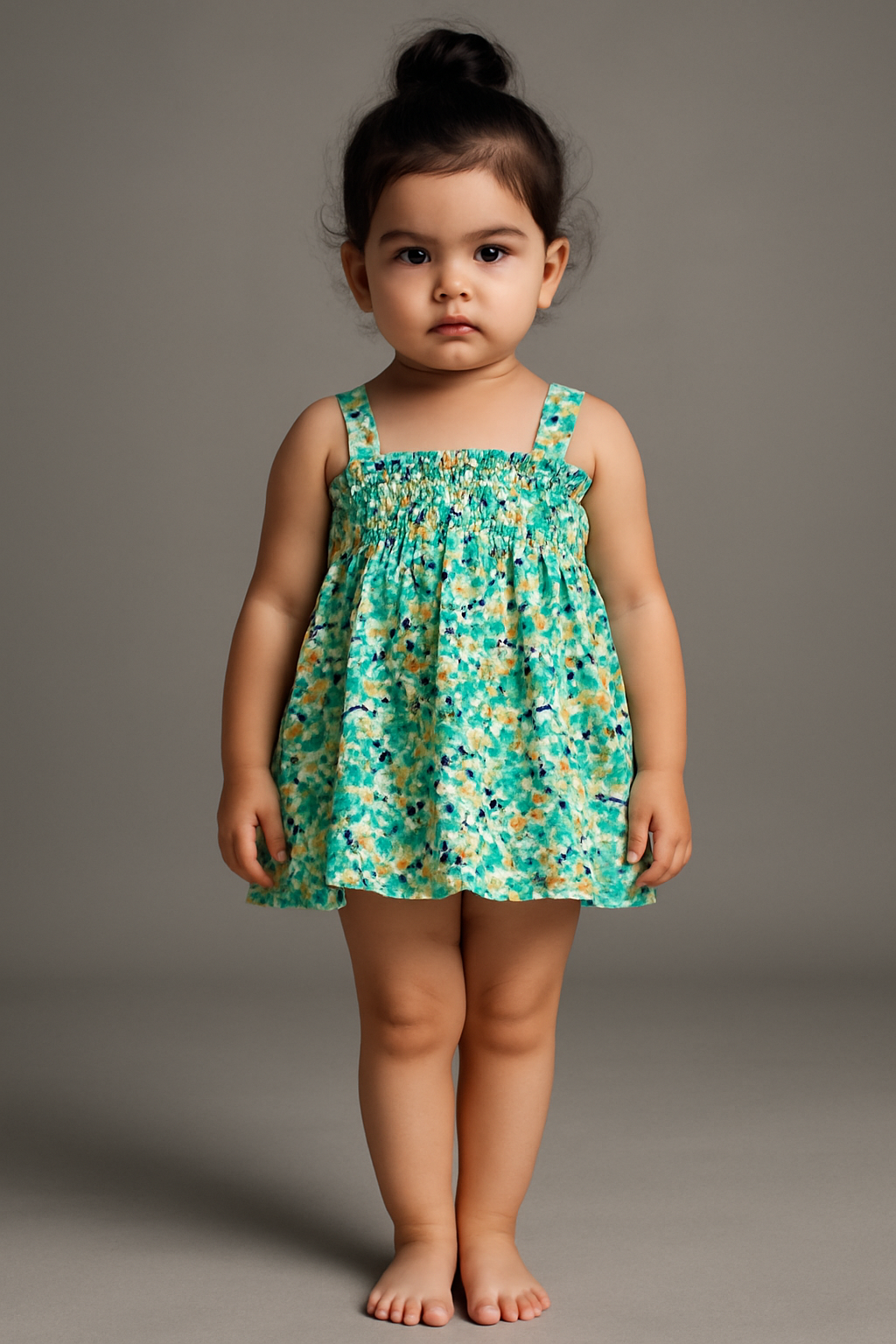 A sleeveless floral printed top with shoulder straps and a smocked bodice, designed for a playful yet comfortable summer look.