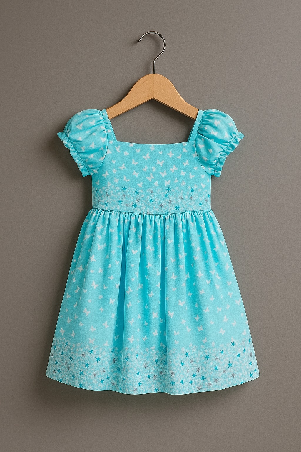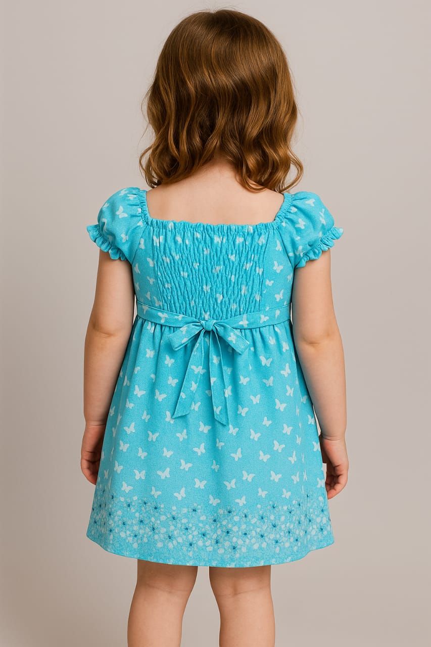 A charming sky blue frock adorned with an all-over white butterfly print, delicate puff sleeves, and a smocked bodice. The dress features an empire waistline with a flared skirt, accented by a cute tie-up bow at the back. Ideal for playful days and dressy occasions alike.