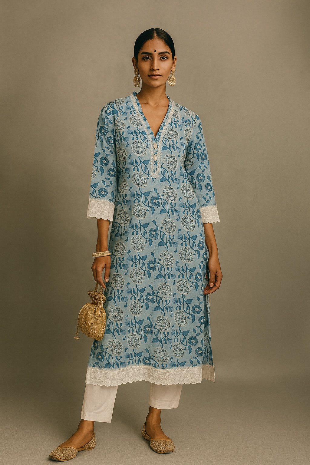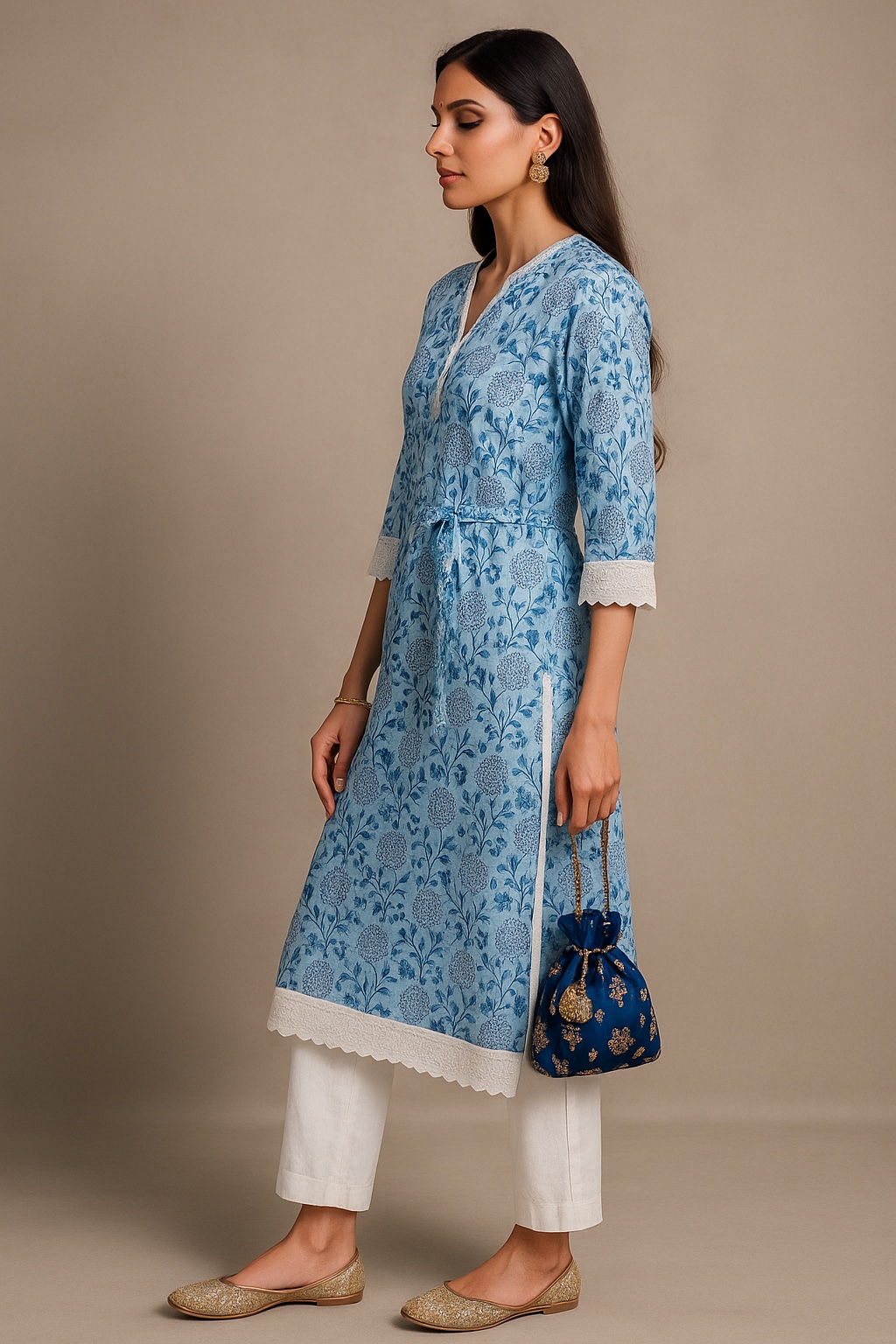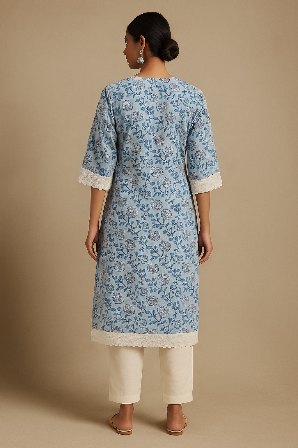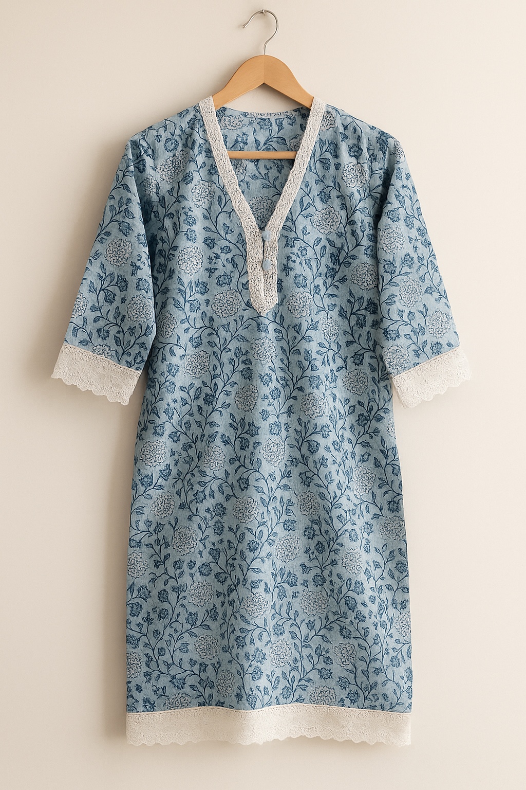 AÂ relaxed and breezy blue floral kaftan-style kurti crafted for everyday comfort with timeless charm. Highlighted by delicate lace on the neckline, cuffs, and hemline, this piece blends tradition with simplicity.
