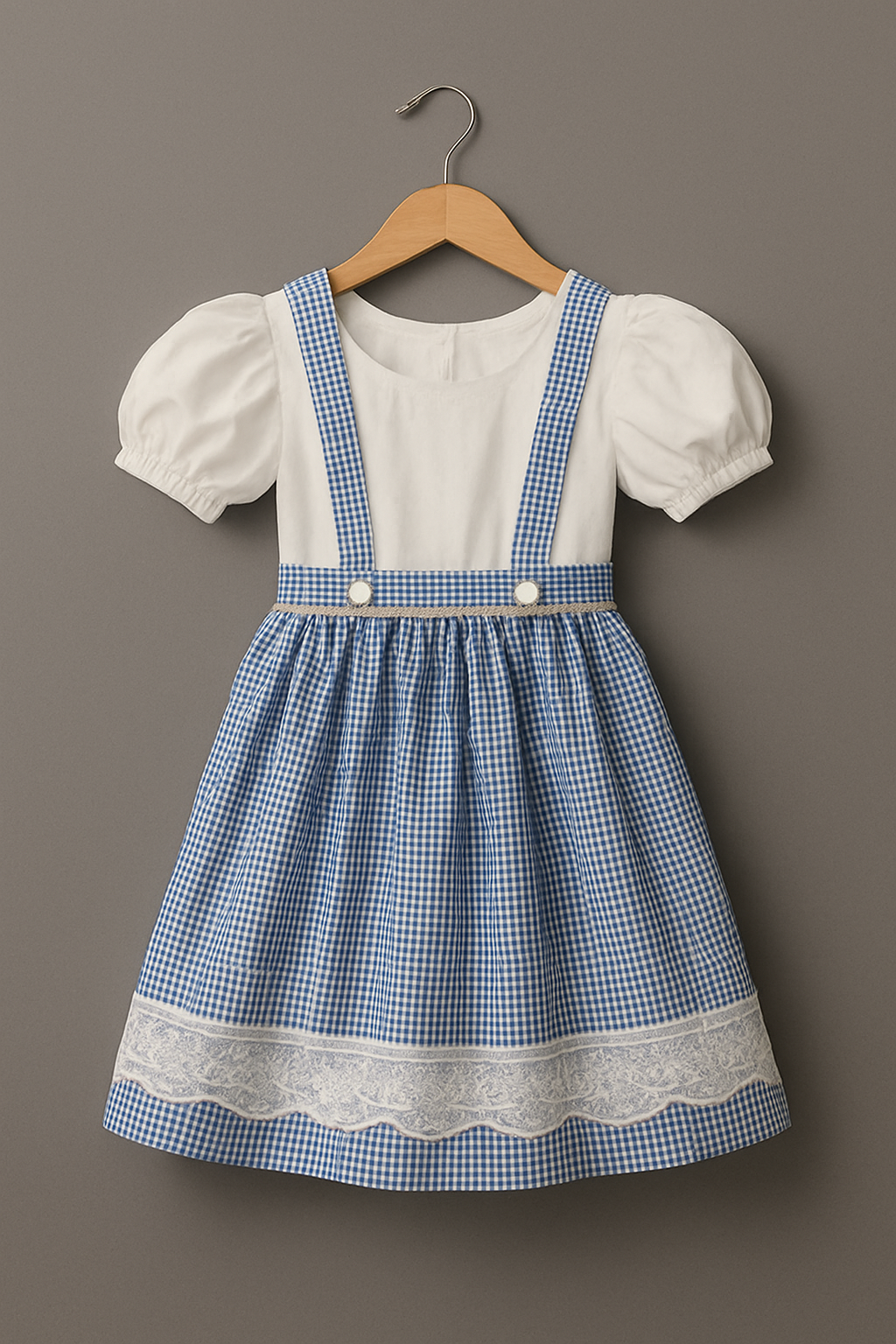 A charming two-in-one dress featuring a classic gingham suspender skirt attached to a soft white puff-sleeve bodice. This timeless design blends vintage charm with modern detailing, perfect for casual to semi-formal occasions.
