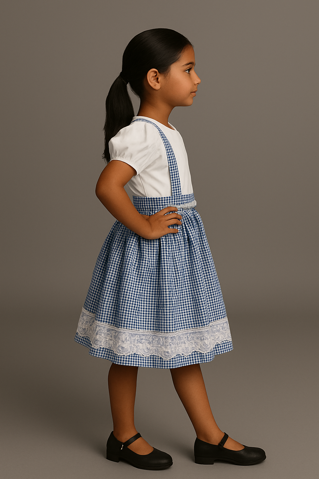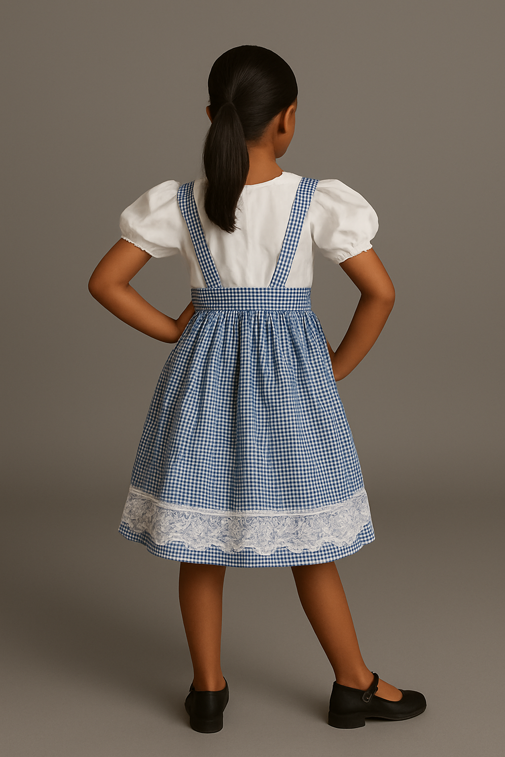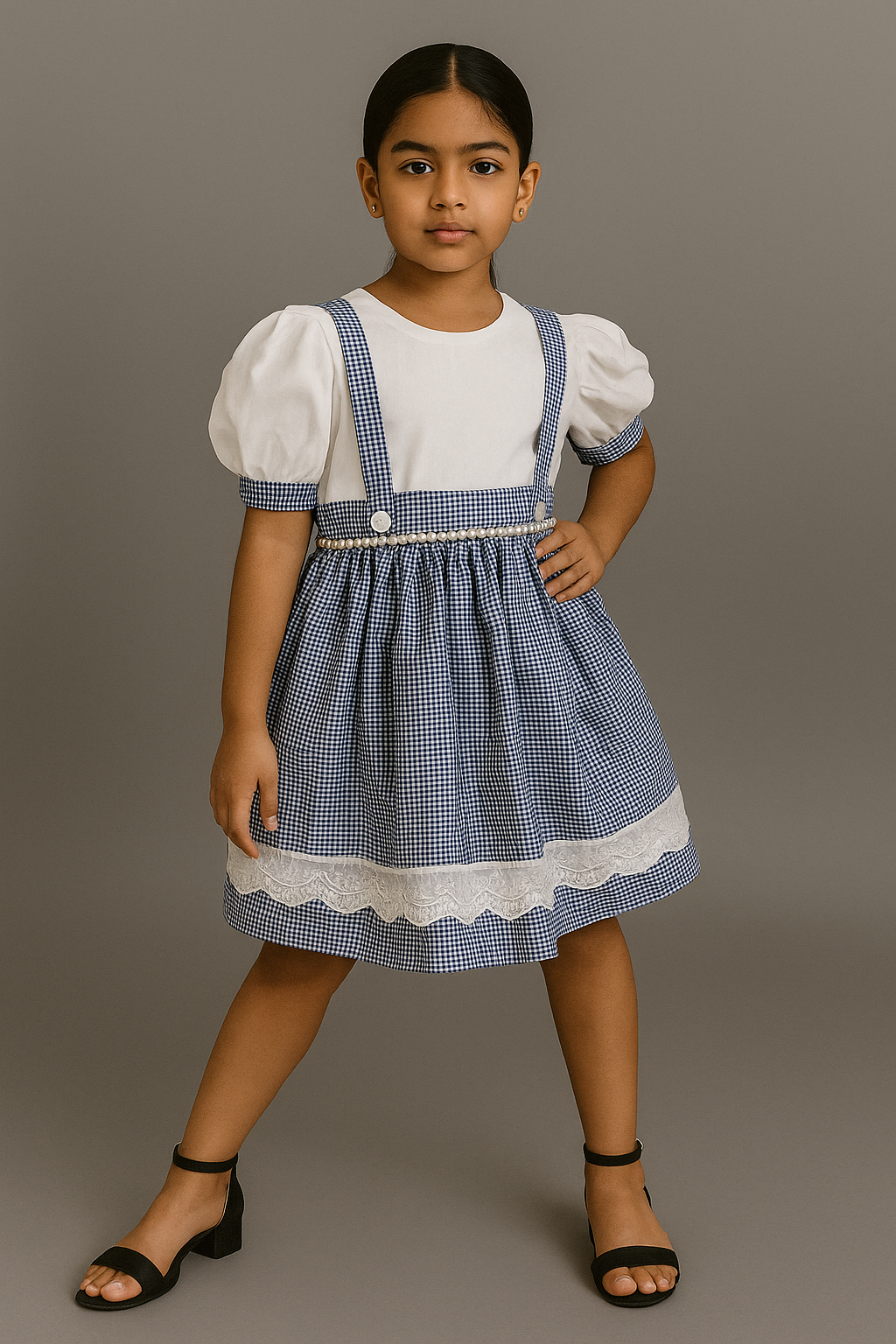 Blue Gingham Suspender Dress with White Puff Sleeve Top