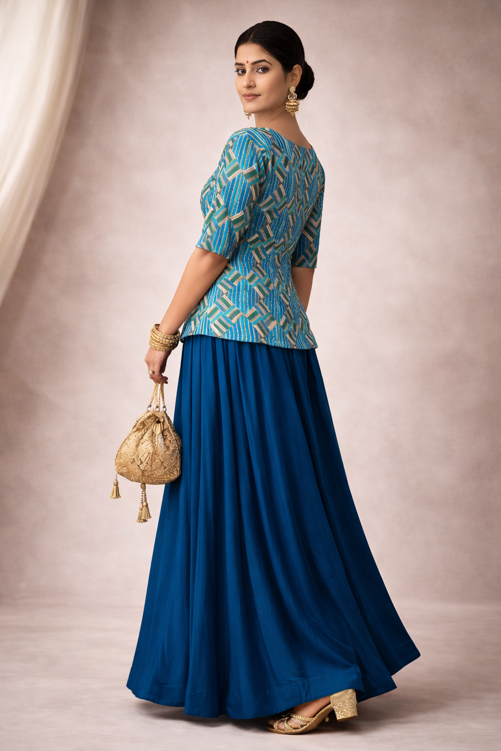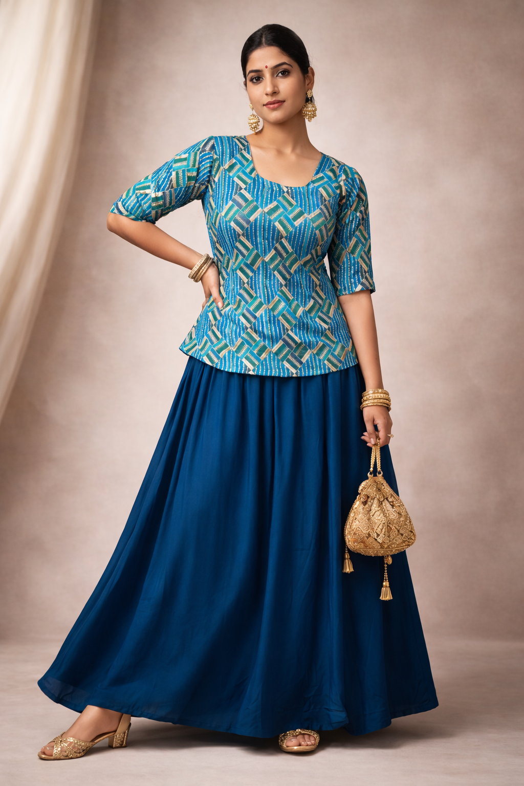 A graceful everyday-to-festive ensemble featuring a beautifully Sequin kurti paired with a flowy flared skirt. Designed for comfort and elegance, this outfit blends traditional craftsmanship with a contemporary silhouette, making it a versatile addition to your wardrobe.
