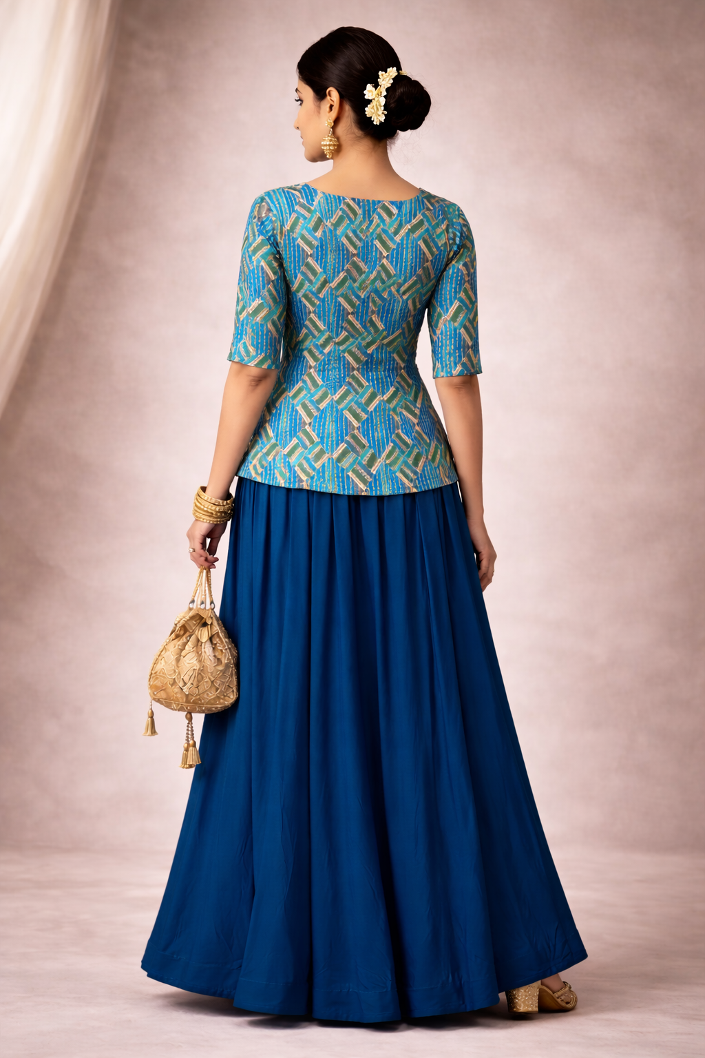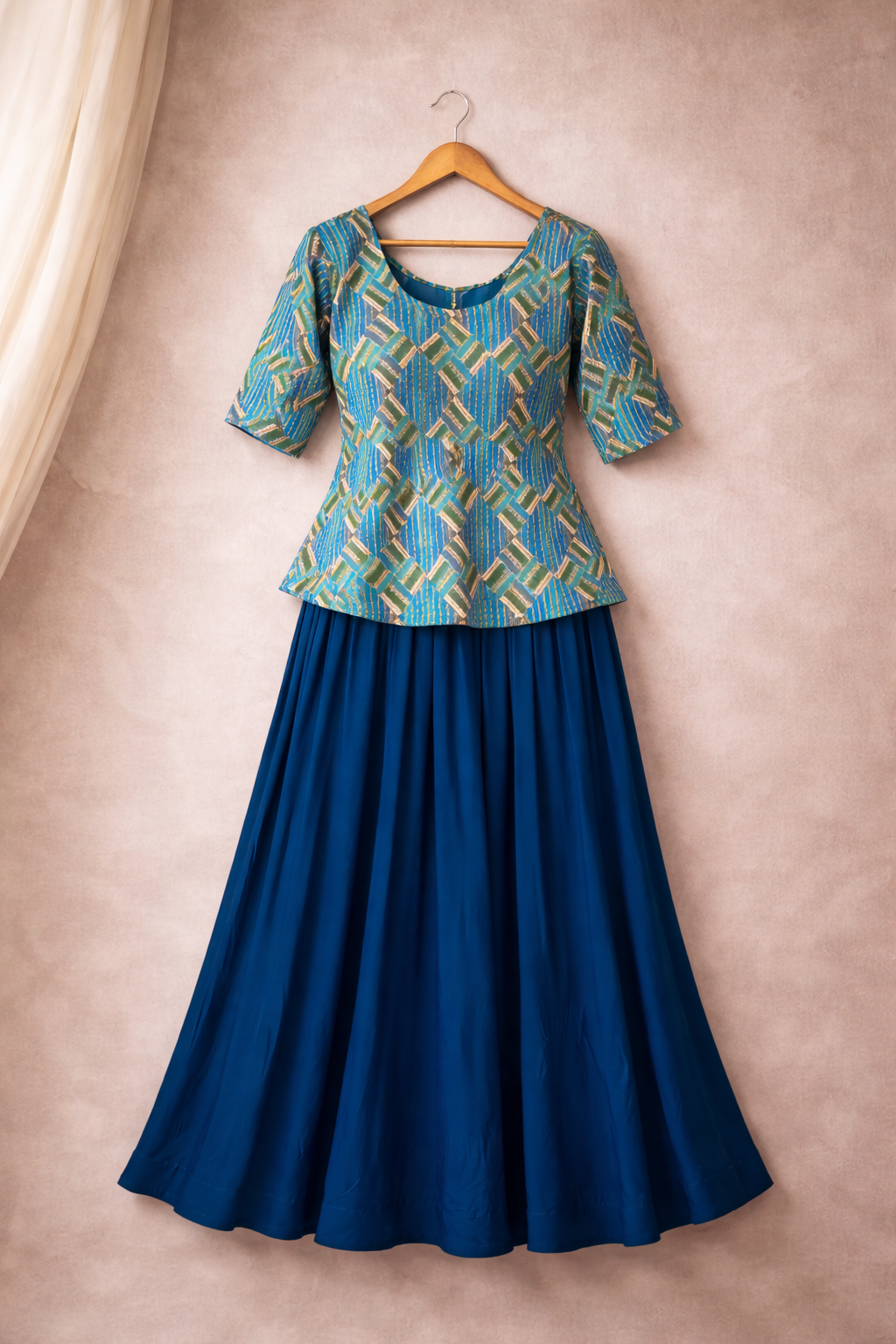 Be the first to review “Blue Handcrafted Printed Kurti with Flared Skirt Set”