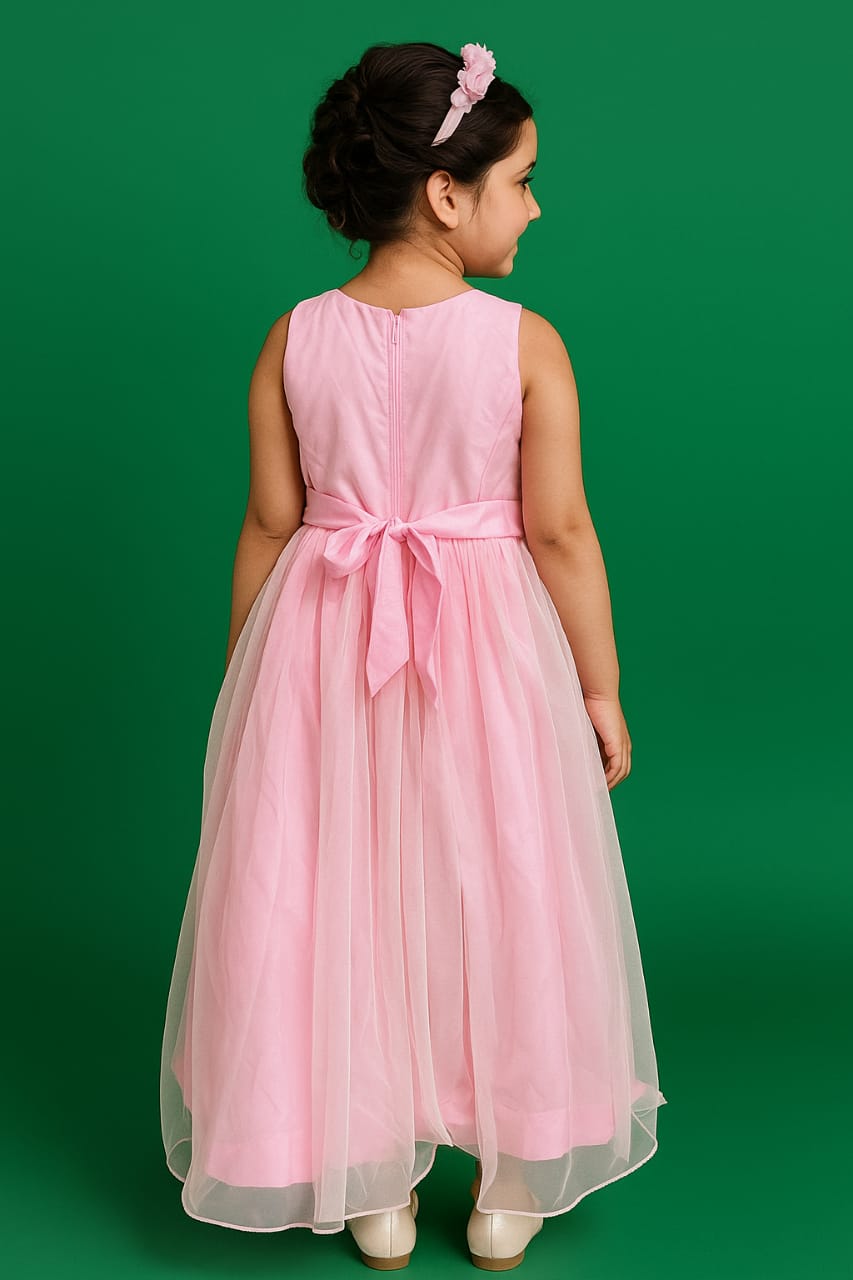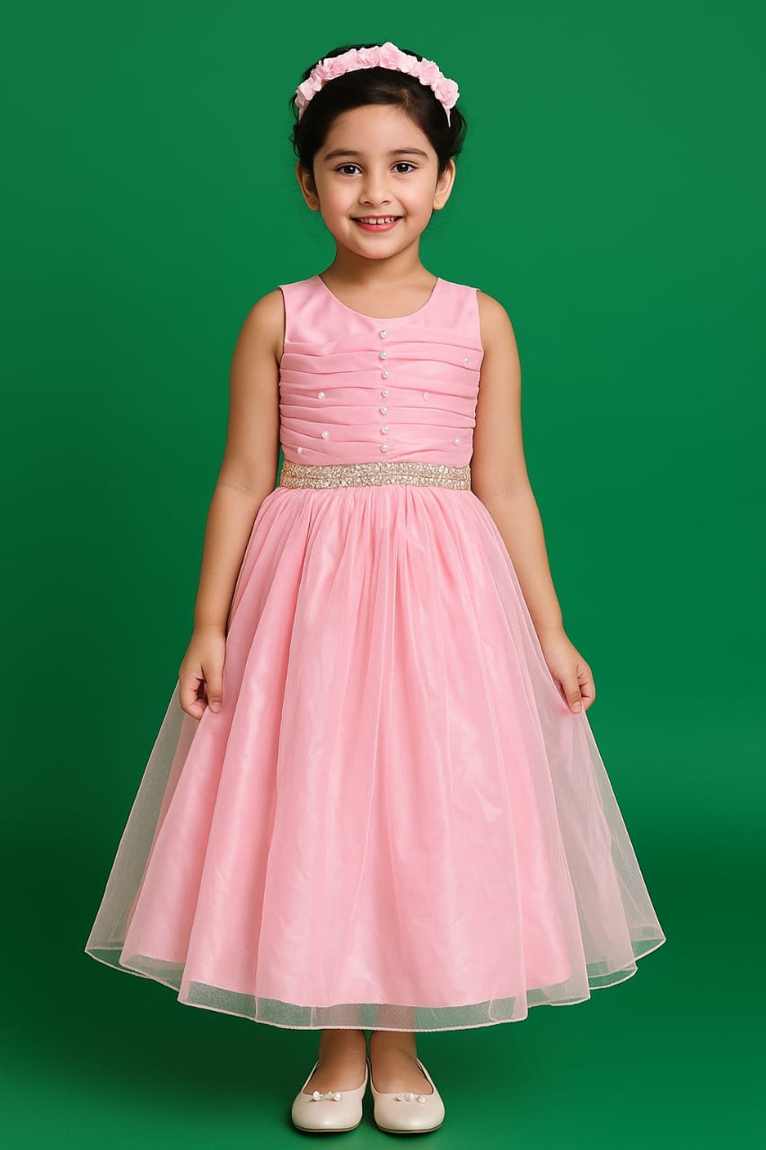 A delightful sleeveless blush pink gown designed for little girls, featuring pleated detailing on the bodice with elegant pearl embellishments. The waistline is accentuated with a shimmering silver band, while the skirt flows in soft layers of net, creating a dreamy and graceful silhouette.