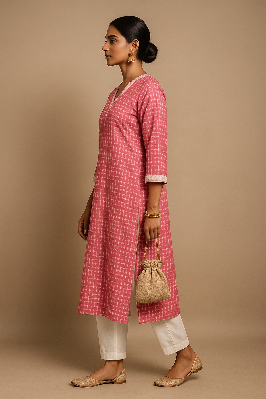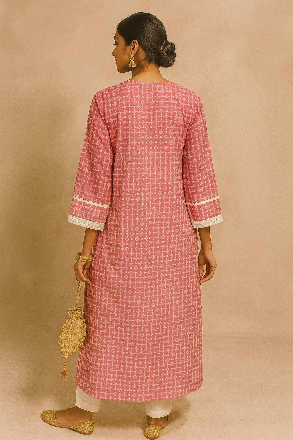 An elegant and minimal blush pink cotton kurti featuring a delicate all-over motif print and a deep V-neckline bordered with lace. Enhanced with soft detailing on the sleeves, this piece is ideal for understated ethnic elegance.