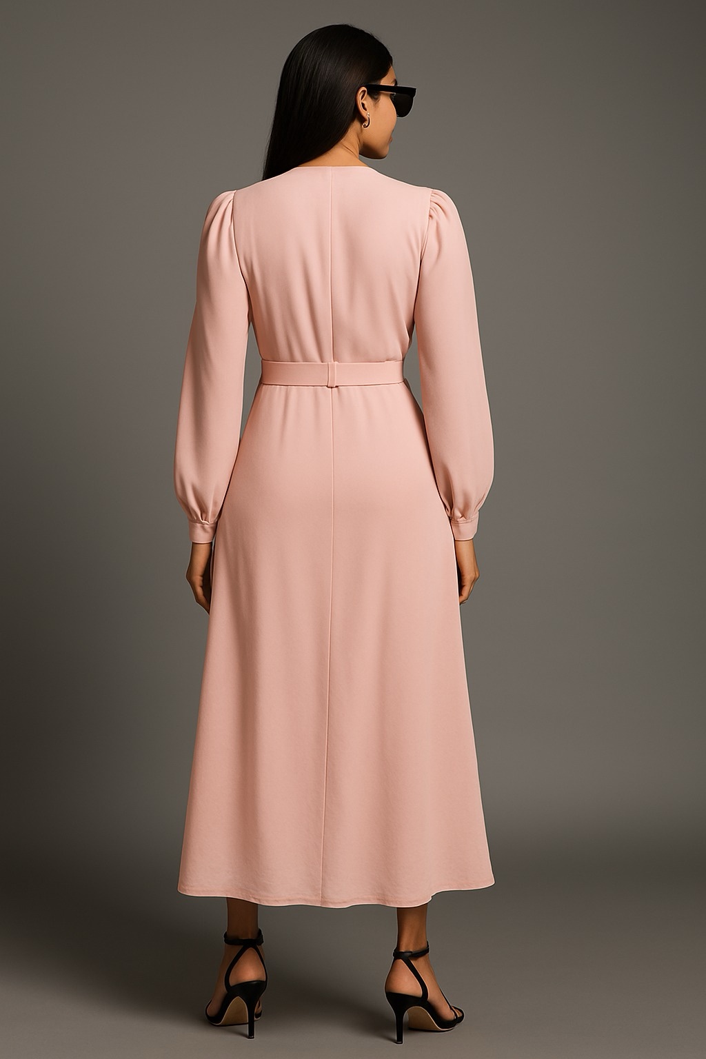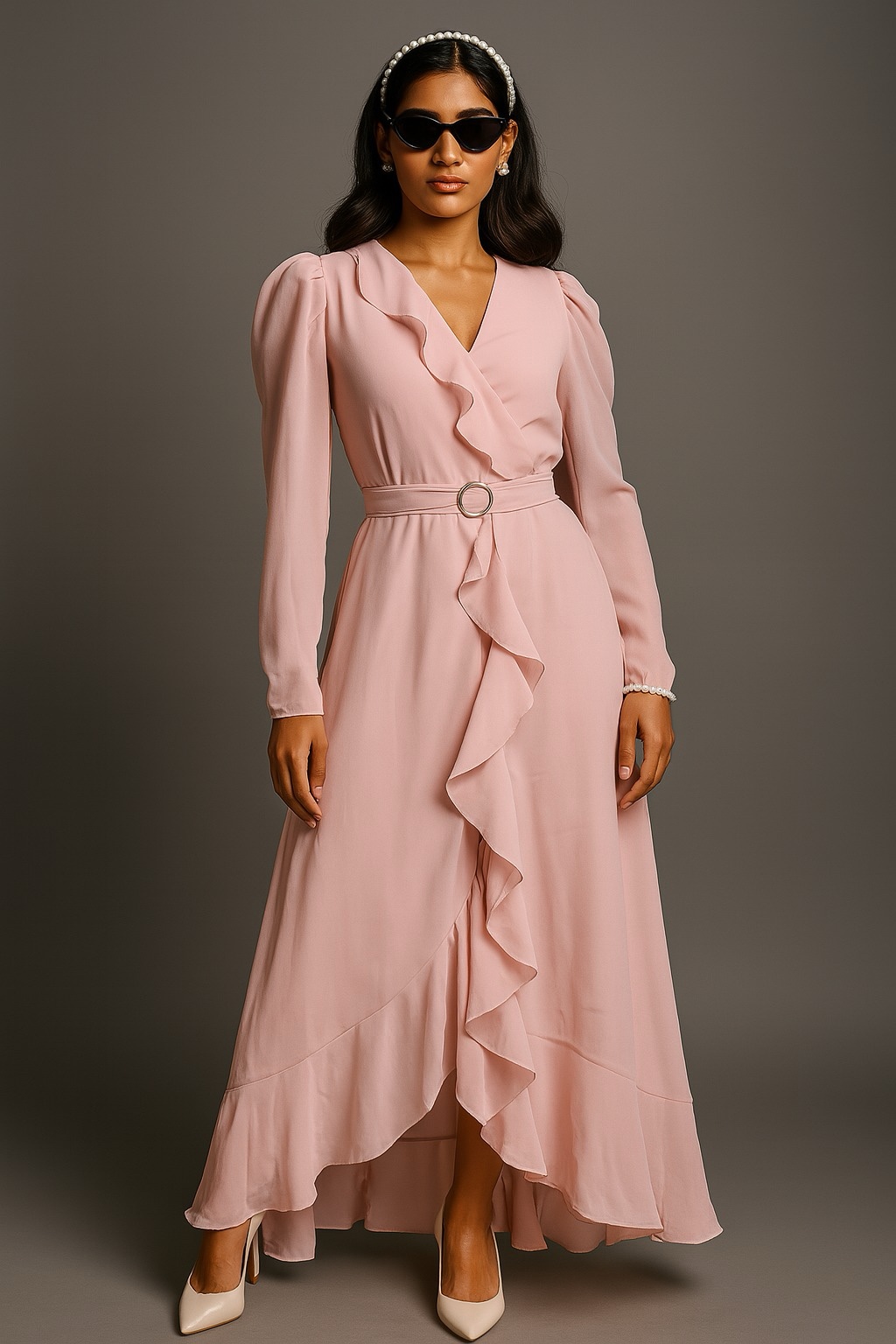 A graceful blush pink full-sleeved wrap-style maxi dress with cascading ruffle detailing and a sleek waist belt. This ensemble effortlessly blends elegance with modern flair, enhanced with puff shoulders and a flattering silhouette.