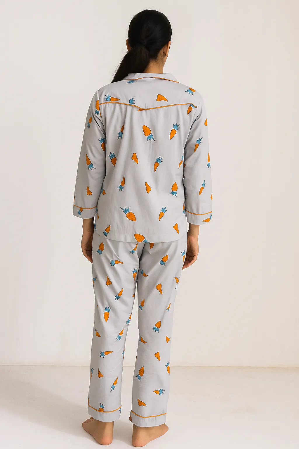 Stay cozy and cute with this Carrot Print Cotton poplin Night Suit Set. Designed for all-night comfort and relaxed lounging, piping on everywhere .The set includes a full-sleeve shirt with a notched collar and matching straight-fit pants—perfect for bedtime, lounging, or lazy mornings.