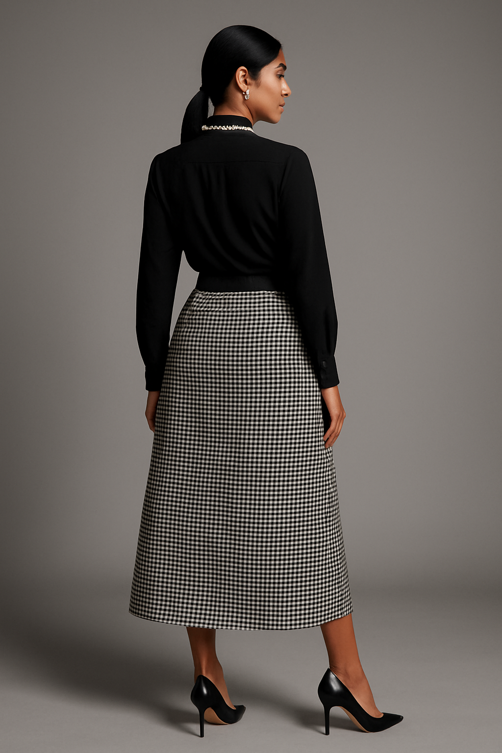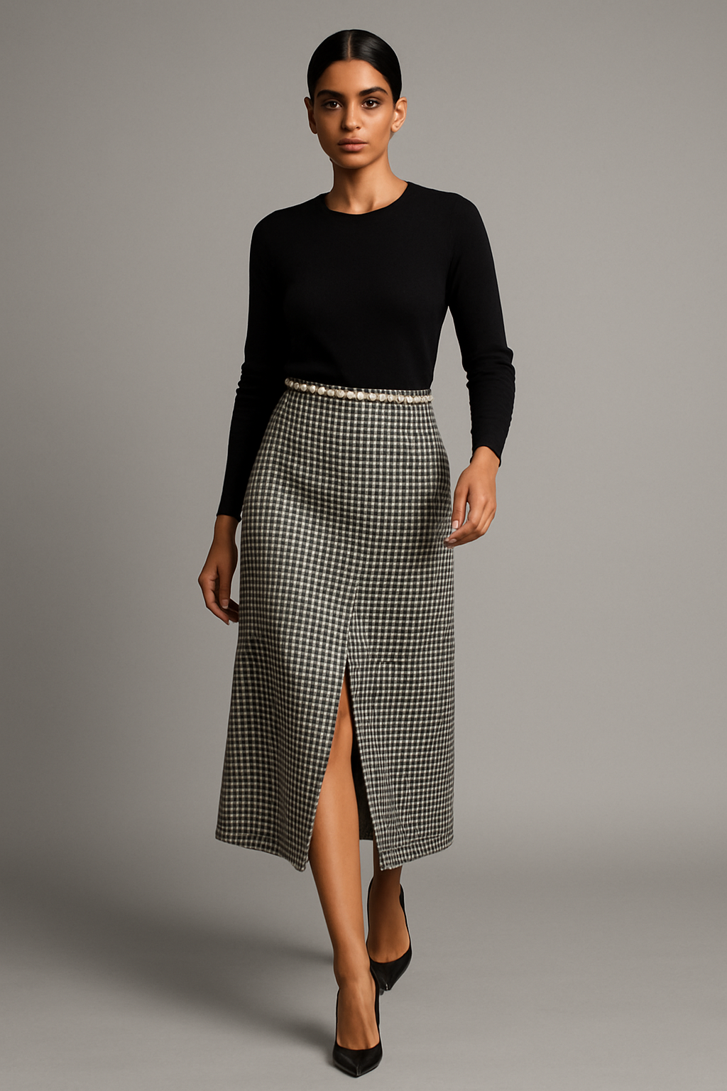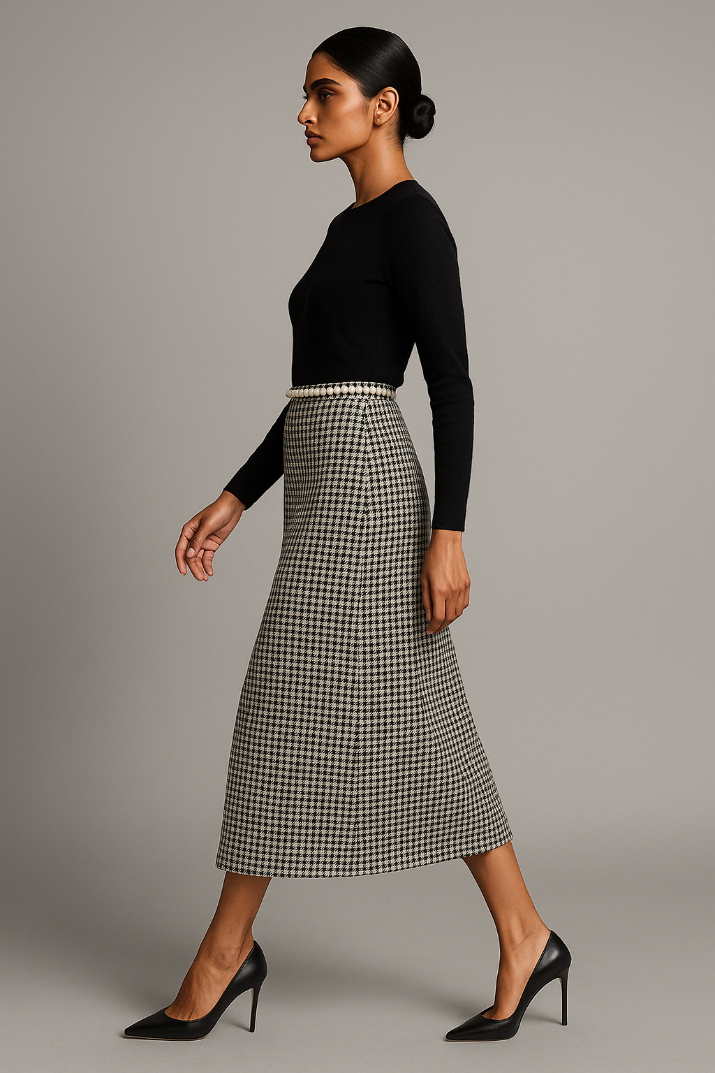 A timeless A-line skirt featuring a black-and-white houndstooth pattern, offering a structured yet elegant everyday look.