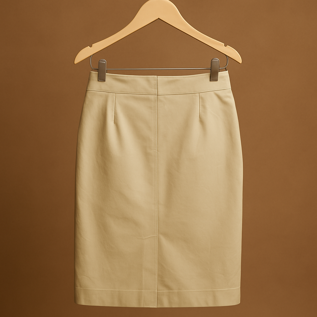 A sophisticated knee-length straight skirt tailored in a refined beige tone, designed for effortless elegance. Featuring a clean silhouette, structured fit, and a subtle side slit for ease and style—perfect for both casual chic and formal looks.