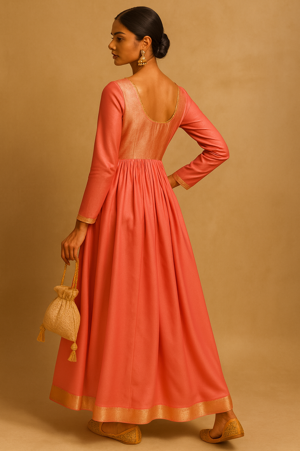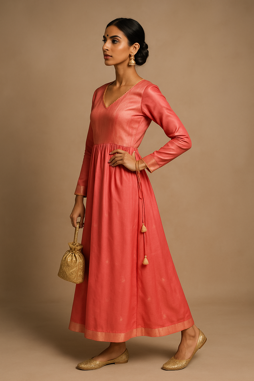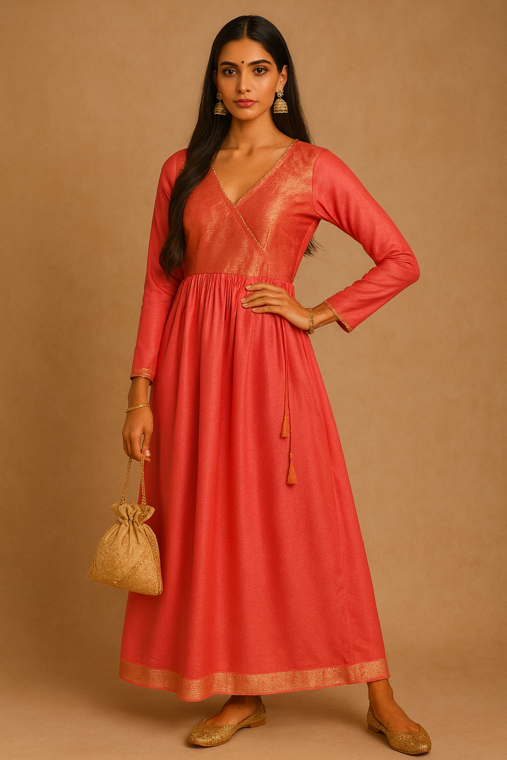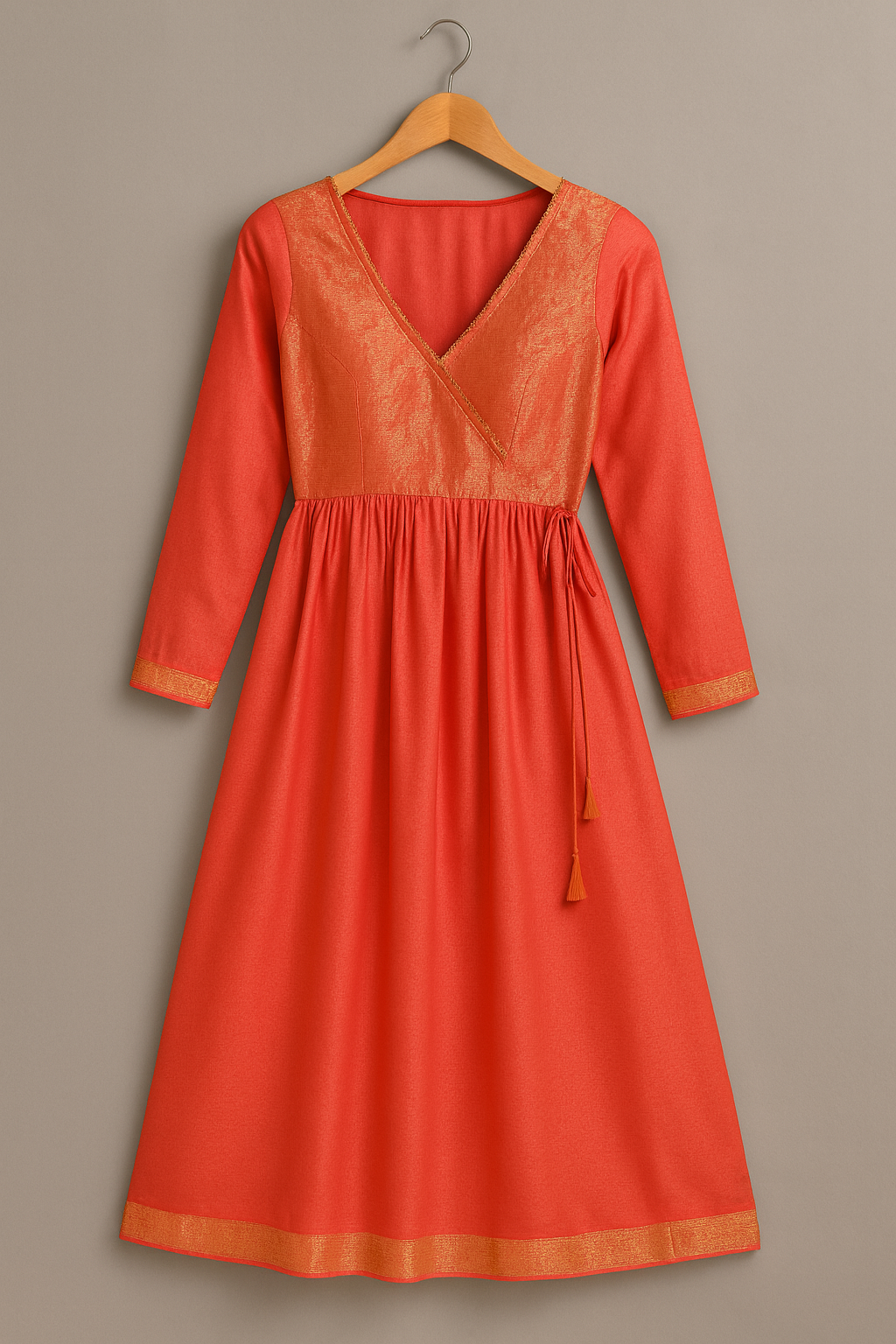 A graceful and timeless full-length Anarkali dress in a vibrant coral hue, detailed with a shimmering gold yoke and intricate golden trims. Features a V-neckline and full sleeves with subtle golden piping, paired with elegant tassel tie-up at the waist for a flattering silhouette.