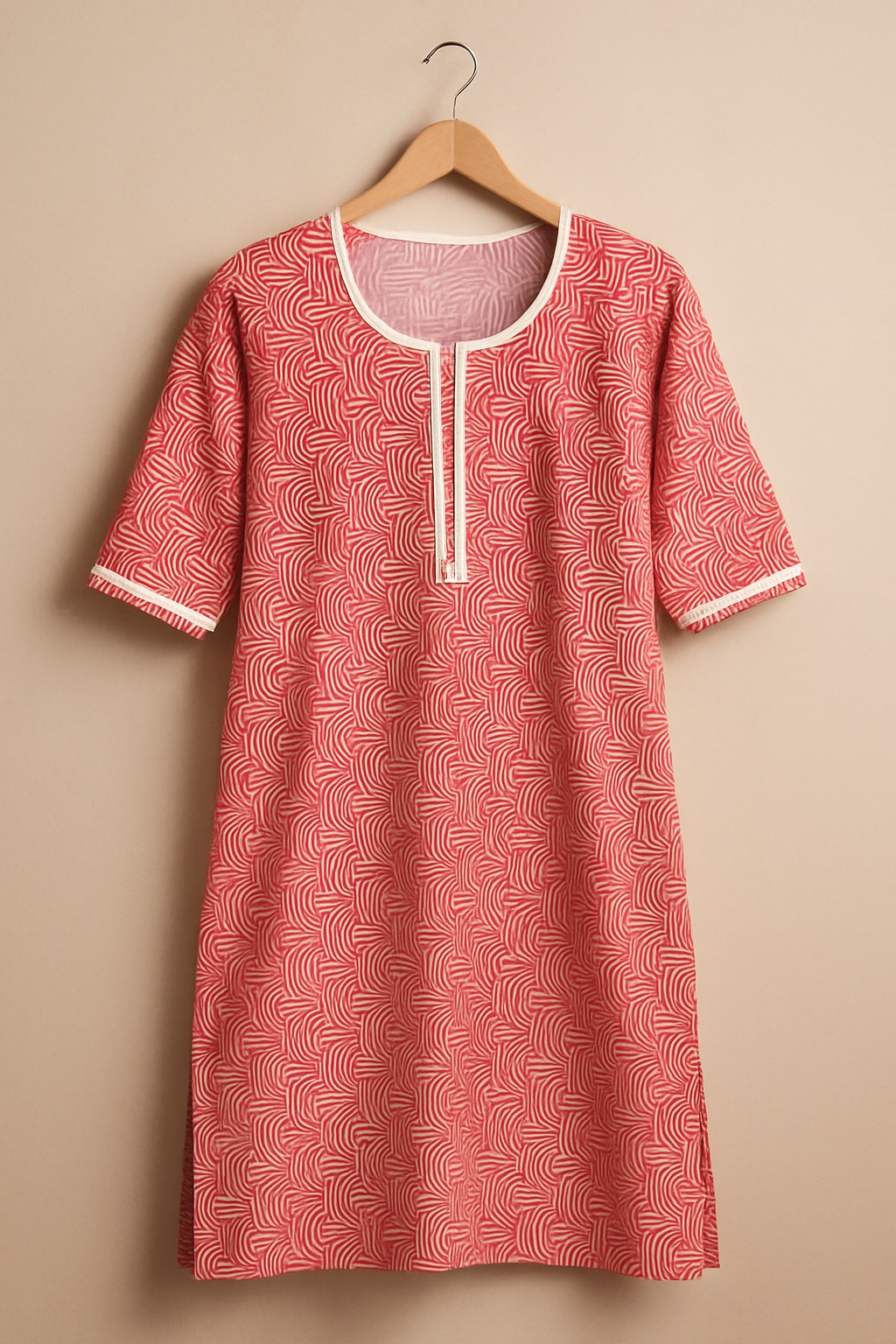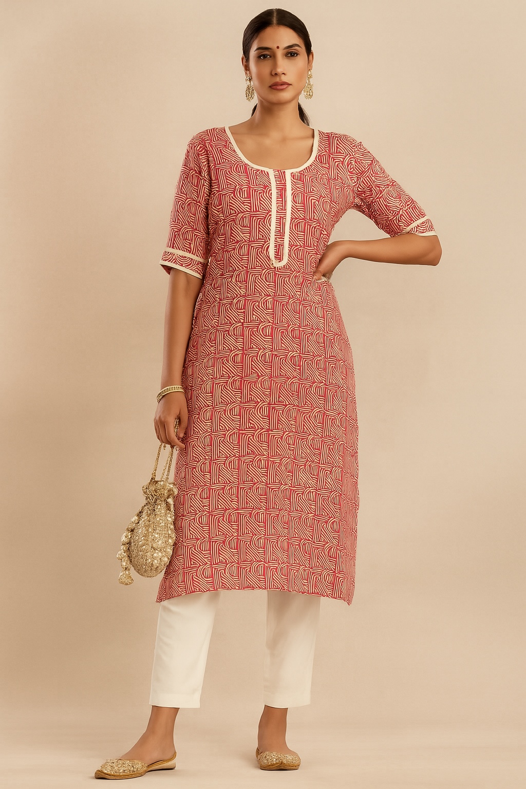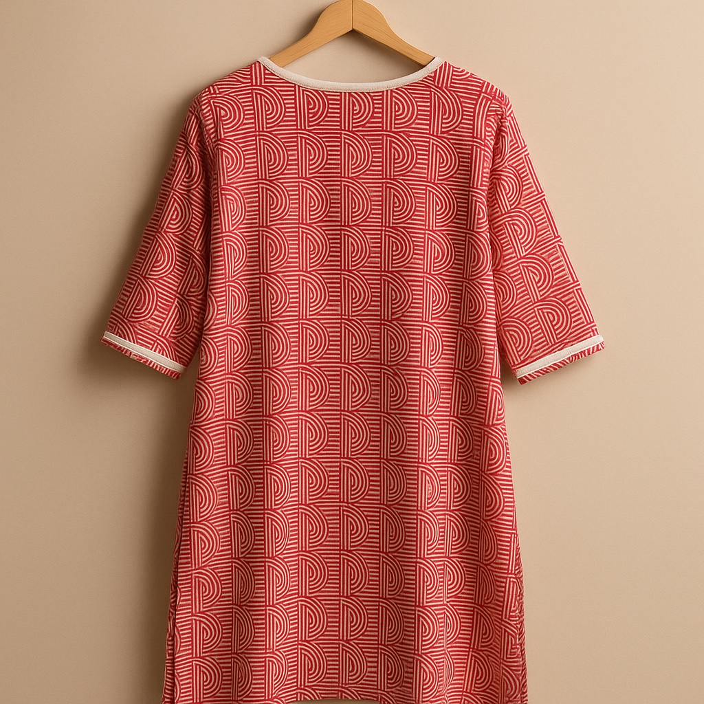 A fresh and modern take on daily ethnic wear, this coral red kurti features a dynamic abstract print with a round neckline and contrast white piping. Lightweight and easy-to-style, it’s ideal for everyday wear.