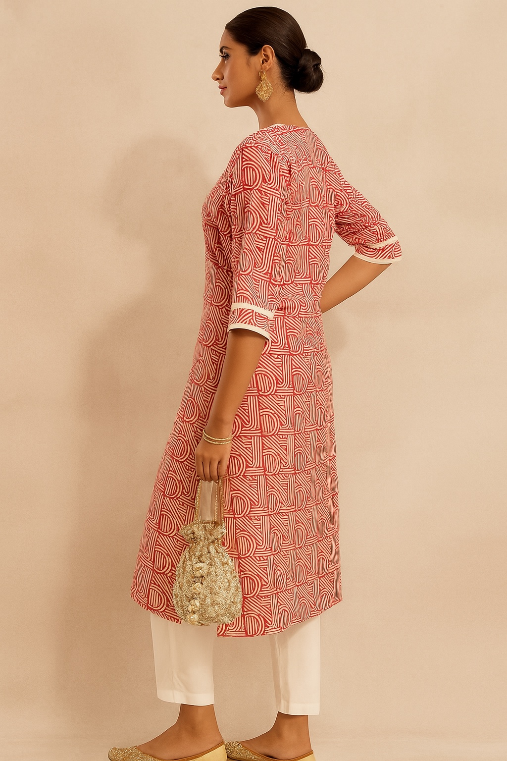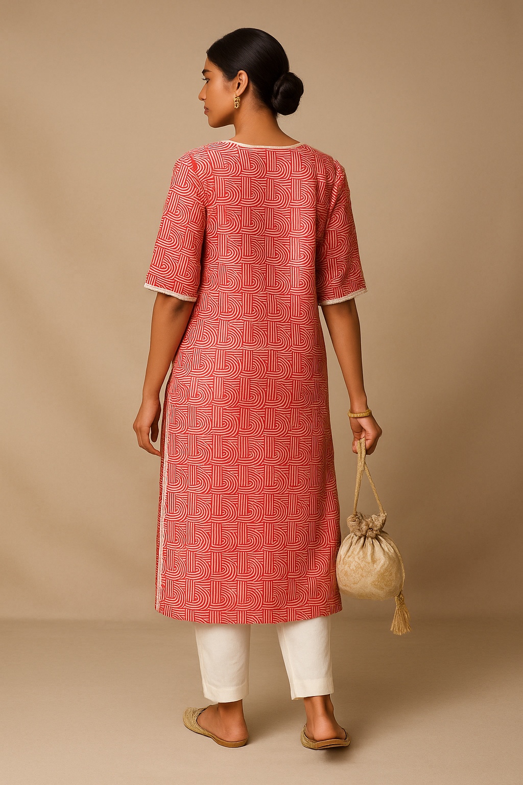 Coral Red Abstract Print Cotton Kurti with Contrast Trim