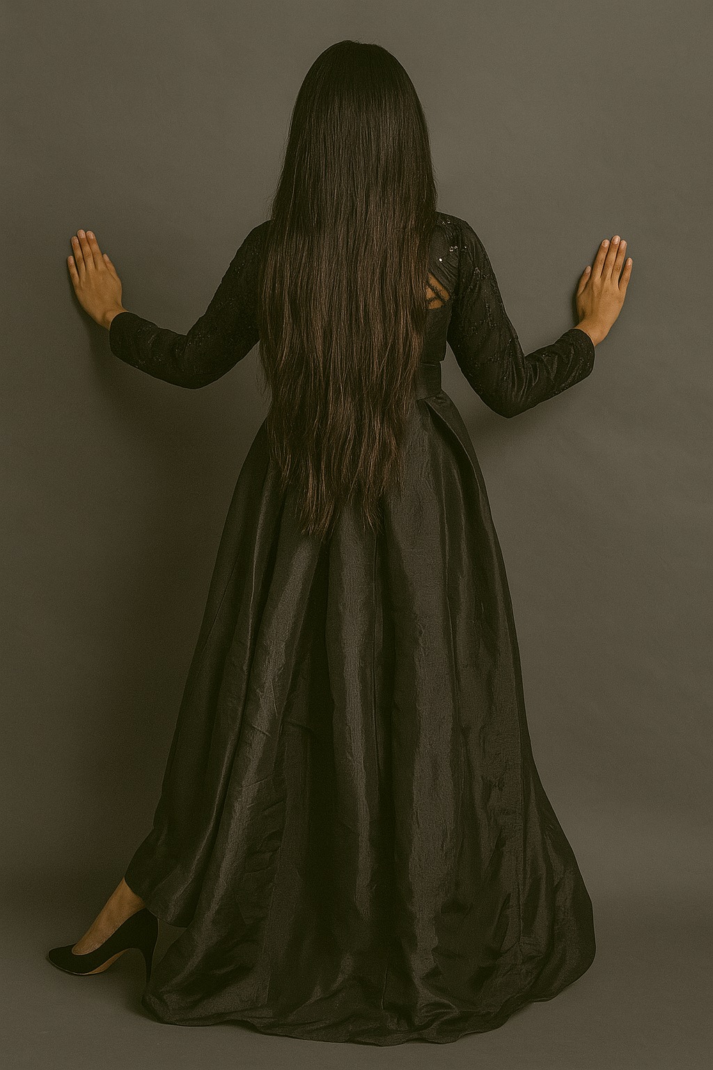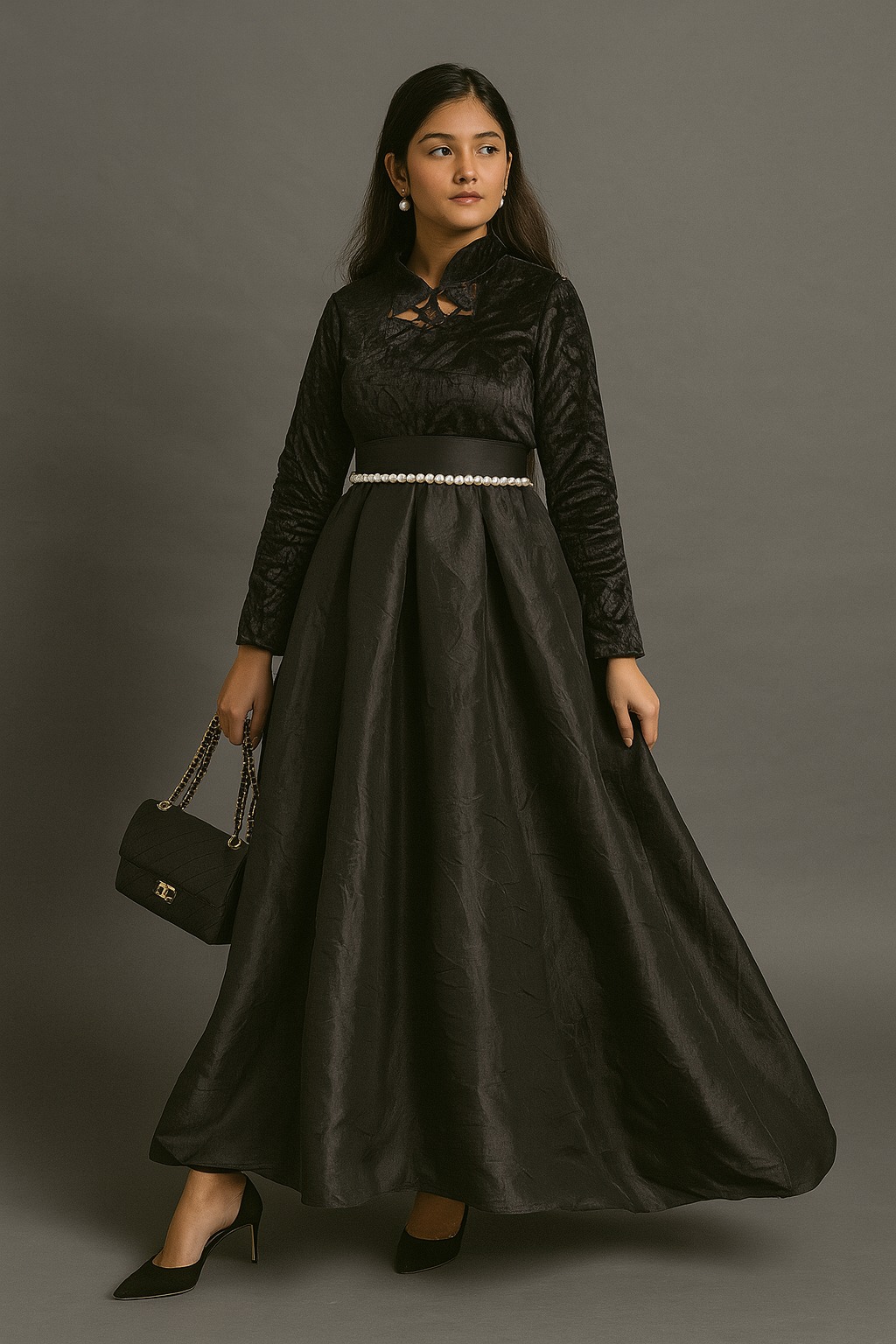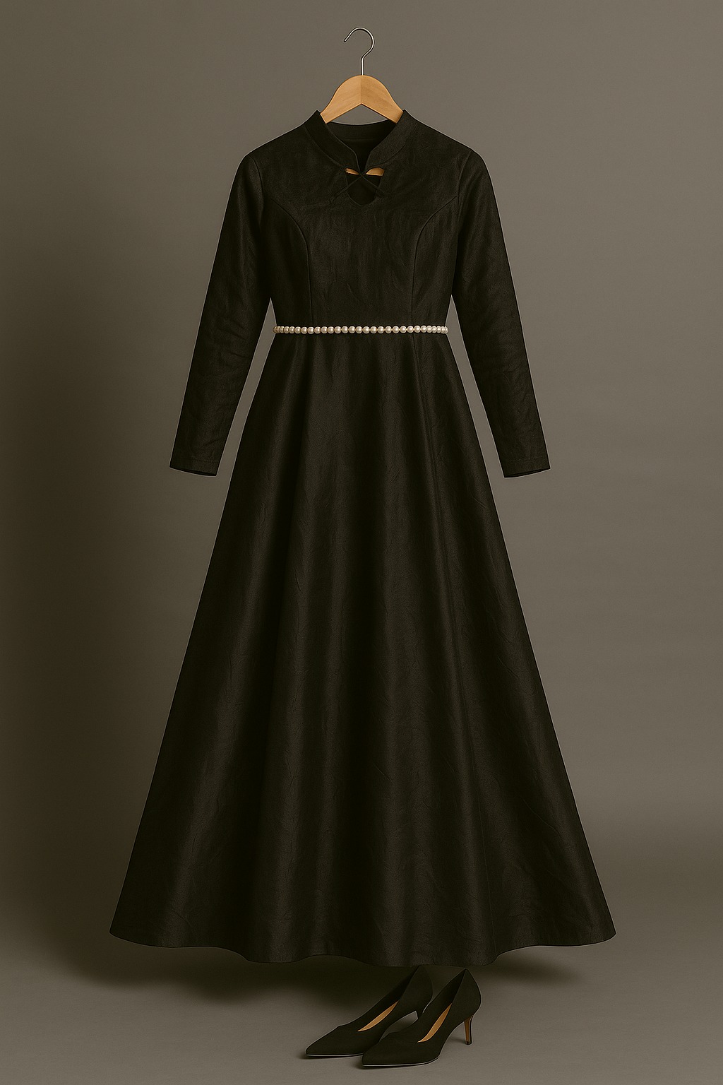 This elegant full-length black gown features a rich textured fabric with subtle sheen, a fitted bodice with long sleeves, and a flared silhouette that flows gracefully. The neckline includes a keyhole cutout detail for added sophistication. Perfect for formal evenings, this gown balances tradition and modern minimalism with a luxe finish.
