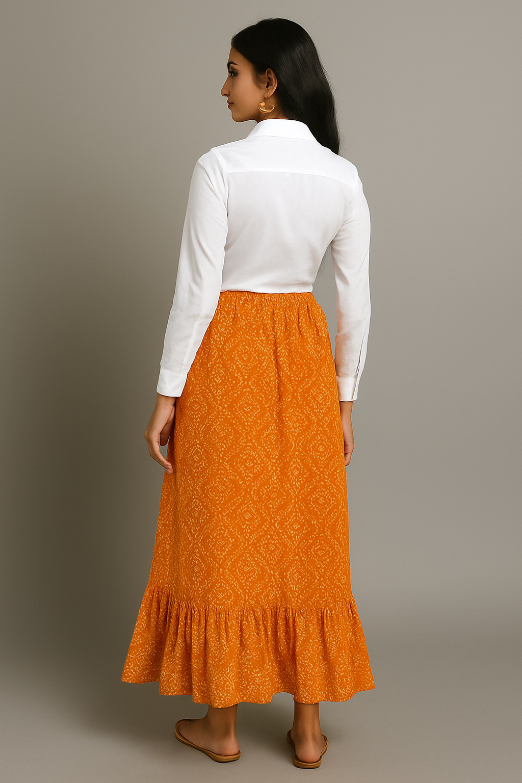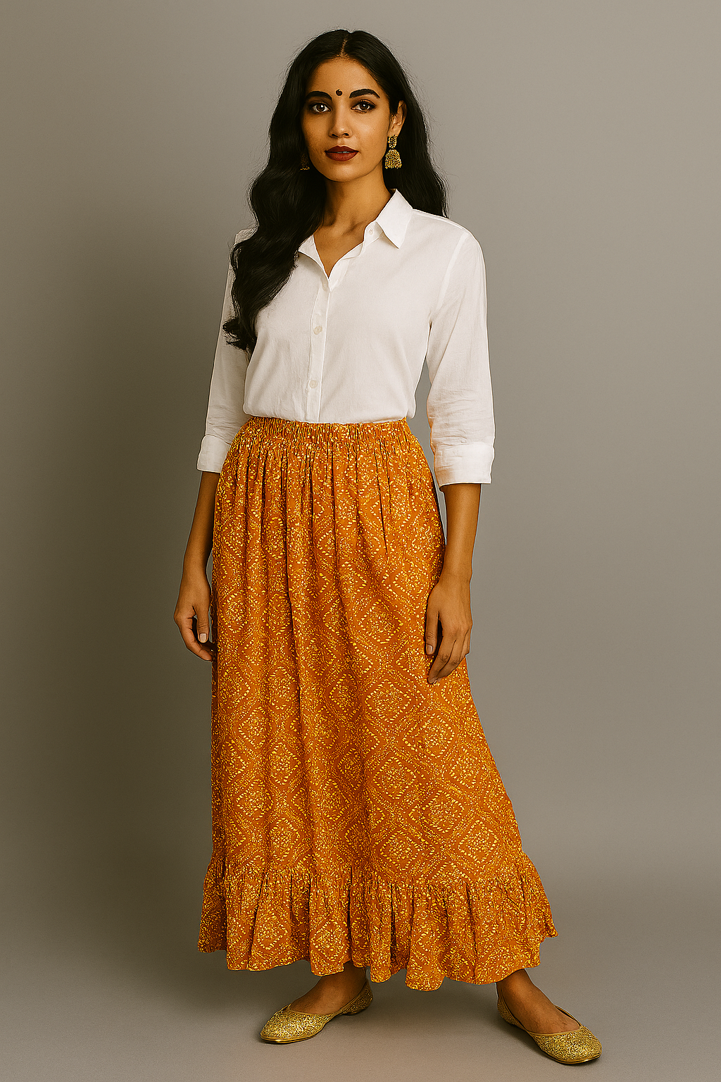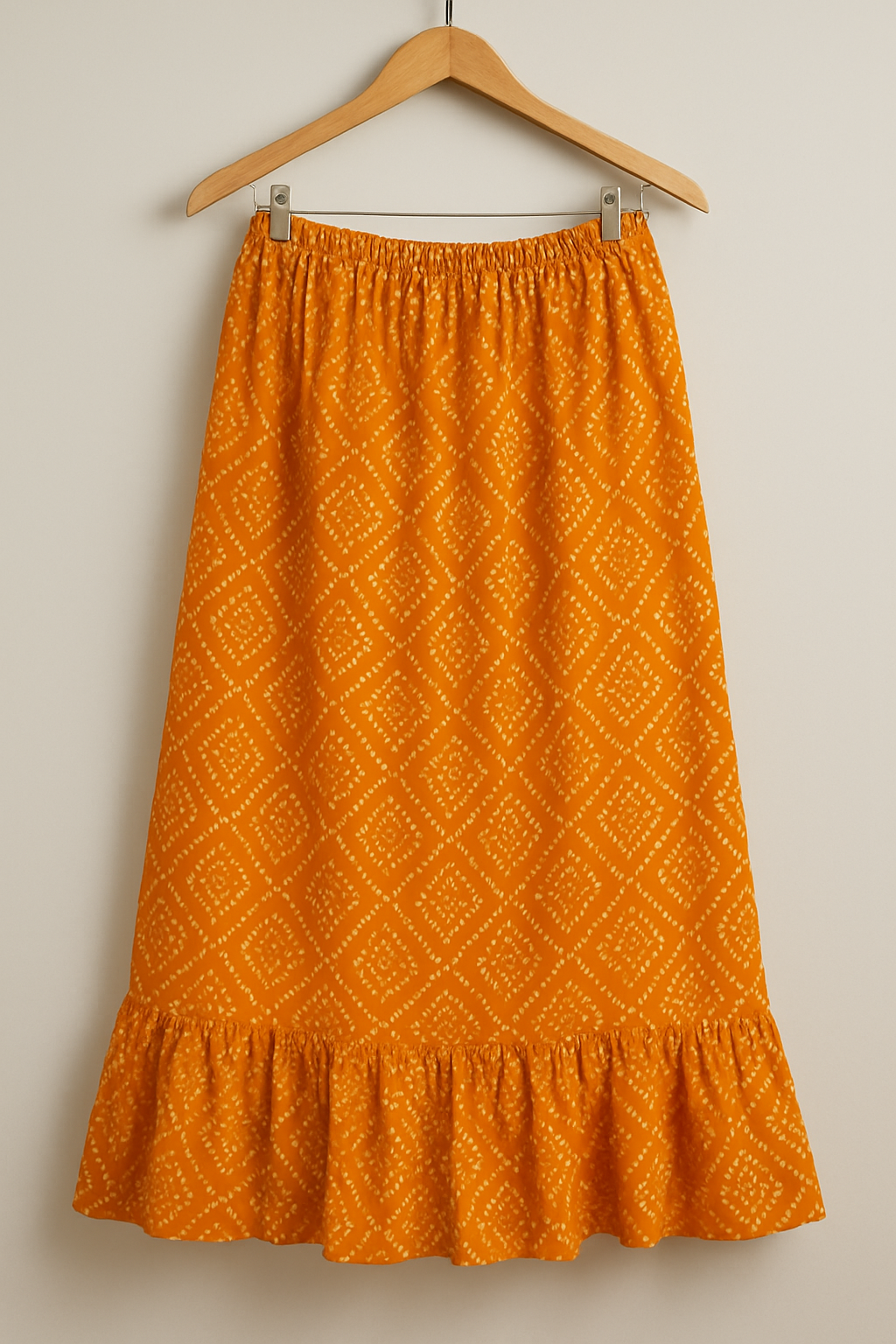 This vibrant Jaipuri skirt in a warm marigold hue is a blend of traditional craft and modern silhouette. With its soft flare and gathered waist, it offers both comfort and ethnic charm. Pair it with a plain shirt or crop top for a chic Indo-western look.