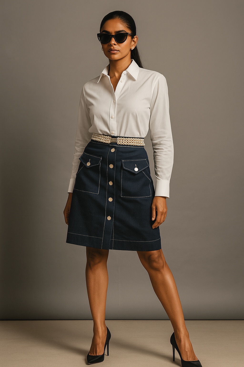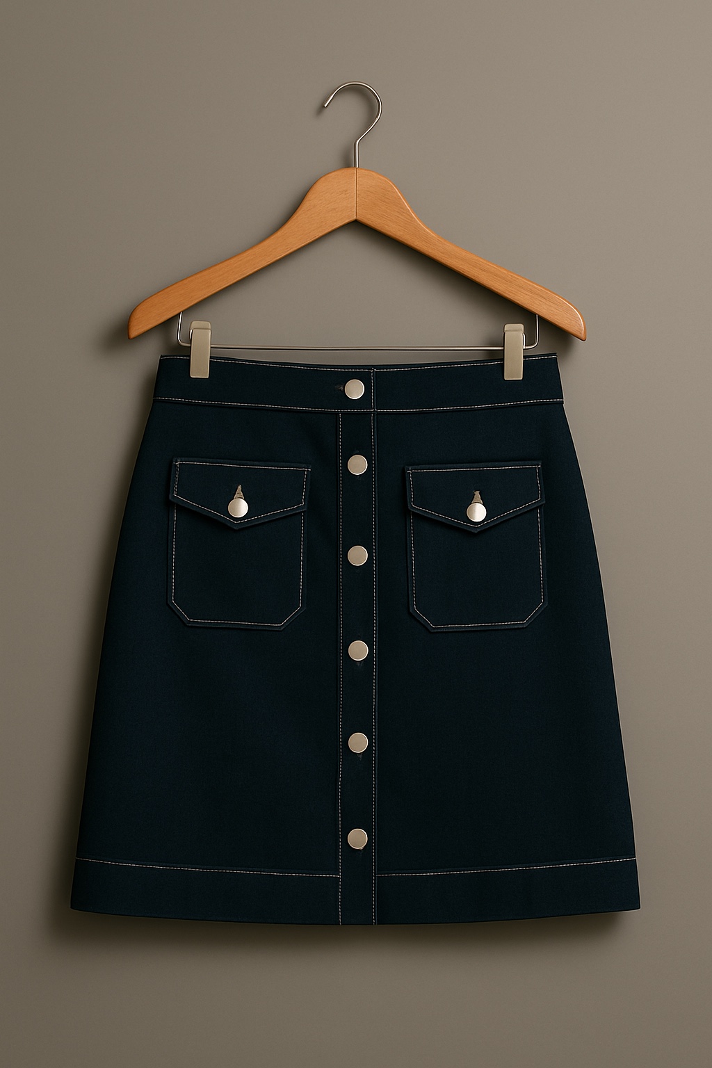 A stylish and structured A-line mini skirt featuring a front button-down closure and two flap pockets with metallic button detailing. Perfect for adding a touch of vintage charm to everyday outfits.