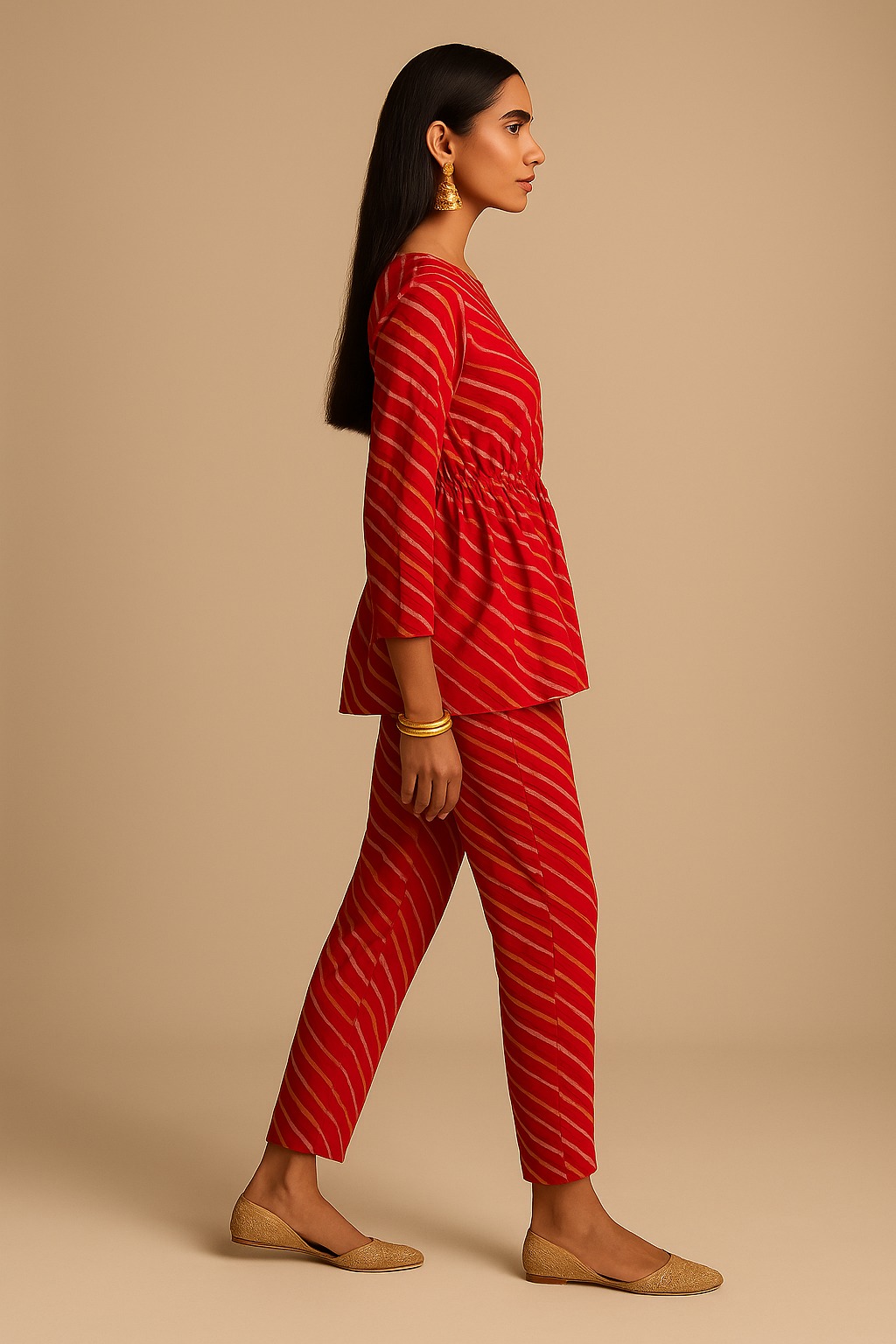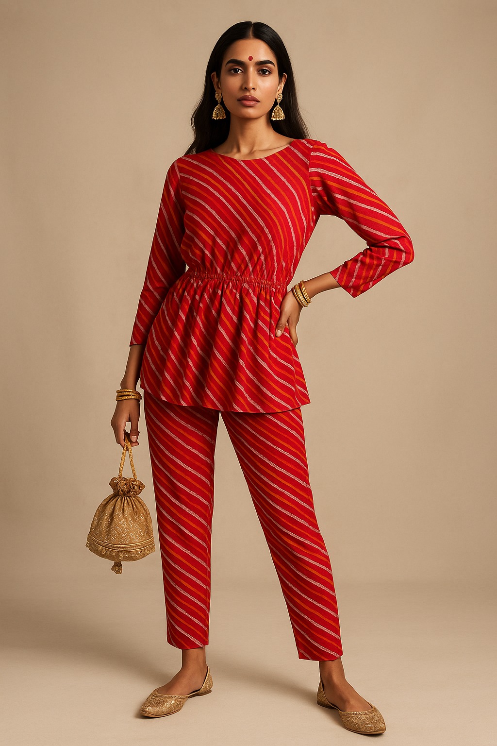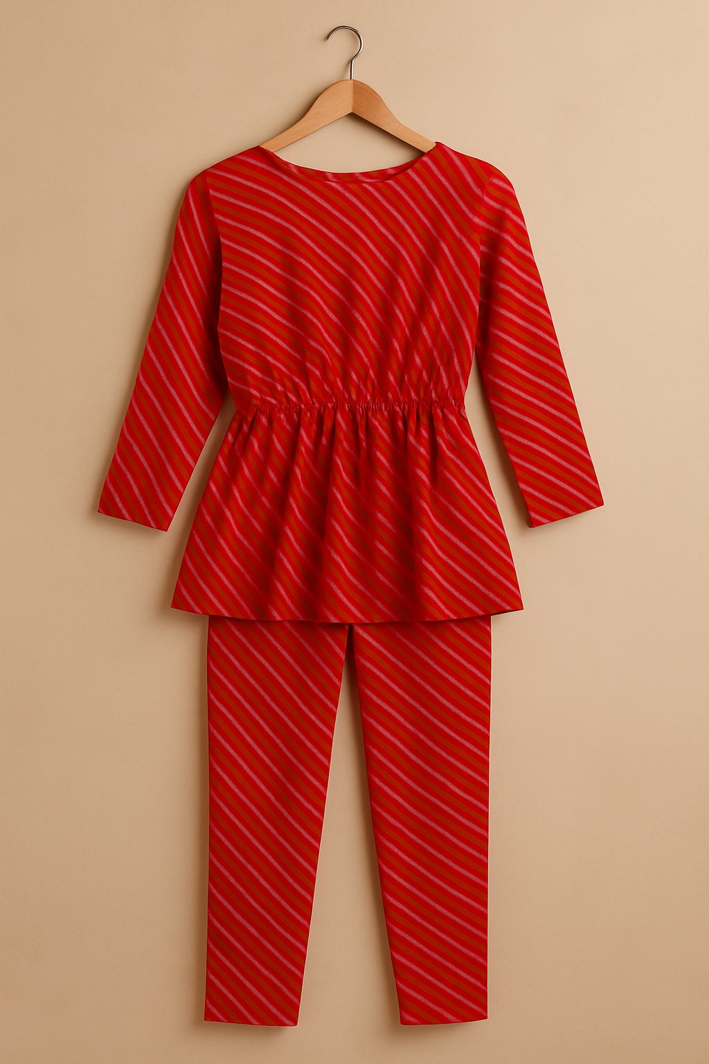 This vibrant co-ord set features a full-sleeve top with a gathered peplum waist and matching slim-fit pants. The diagonal stripe pattern adds a playful and dynamic look, perfect for young girls who love both comfort and color.
