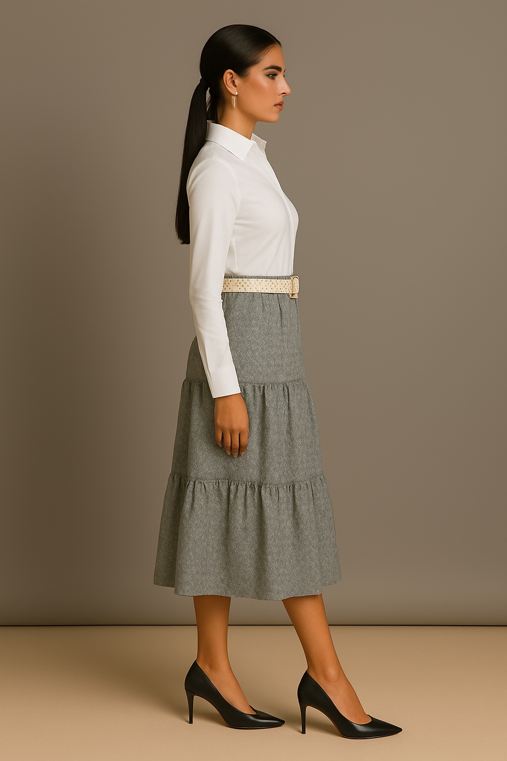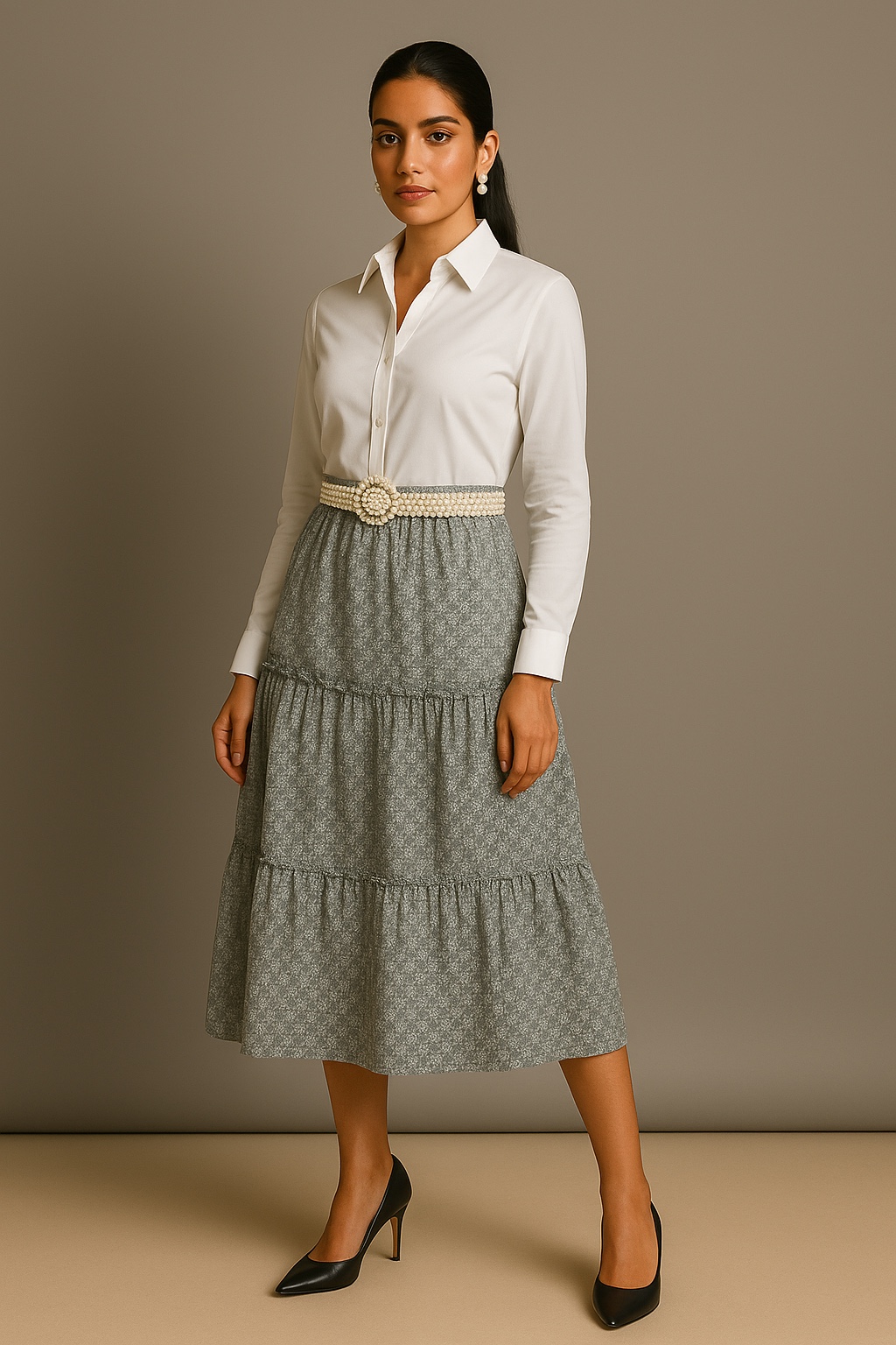 Add effortless grace to your wardrobe with this elegant grey printed tiered midi skirt. Featuring delicate all-over floral motifs and a soft, flowy silhouette, the skirt falls beautifully in three gathered tiers. Its versatile design is perfect for both casual and semi-formal occasions. Style it with a crisp shirt or a tucked-in blouse for a chic, timeless look.