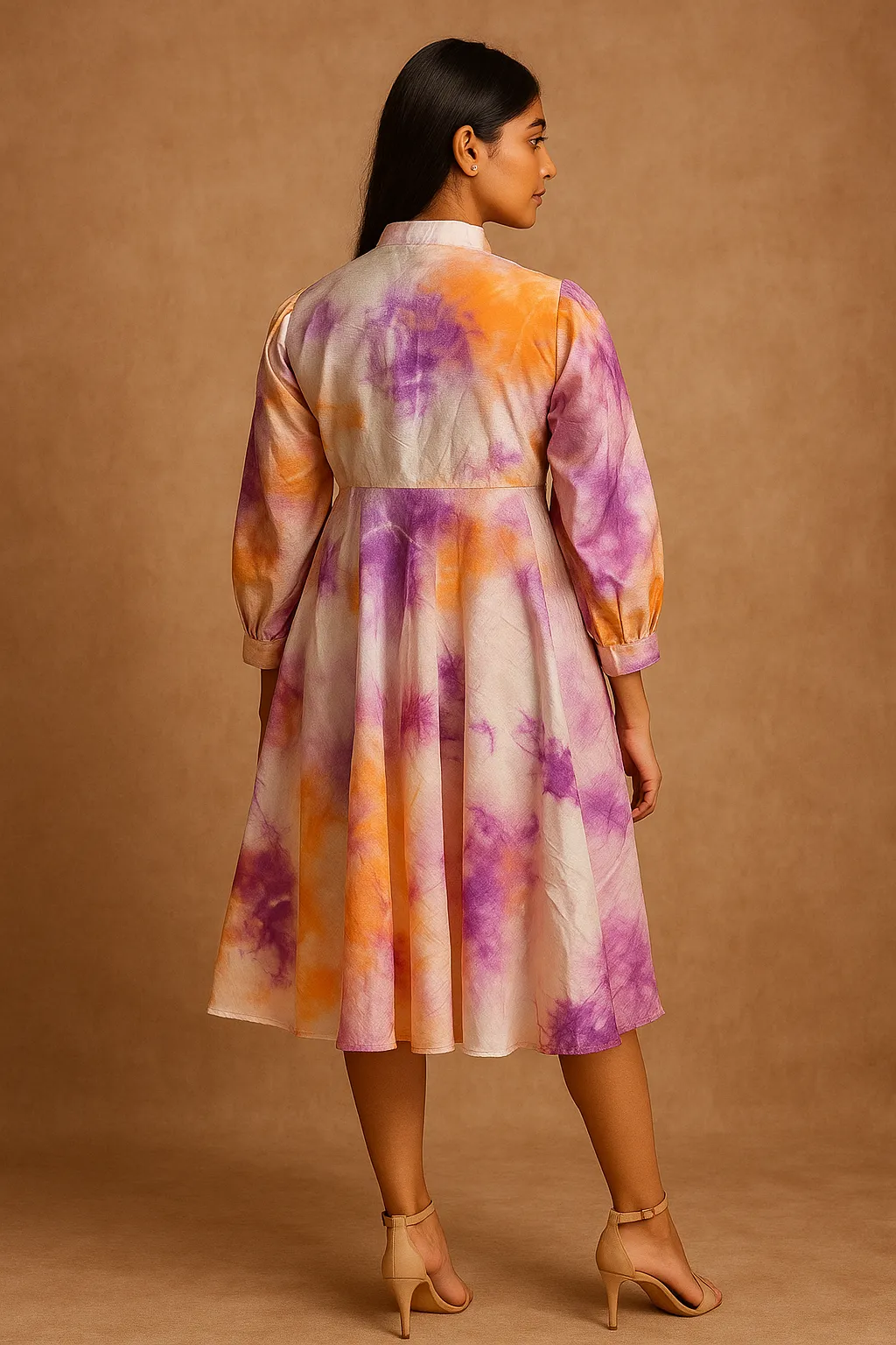 The Hand-Dyed A-Line silk Dress is a Featuring a unique tie-dye pattern in radiant hues of violet, tangerine, and cream, this dress brings a fresh, artistic touch to your wardrobe. The dress is thoughtfully designed with a flattering fit-and-flare.