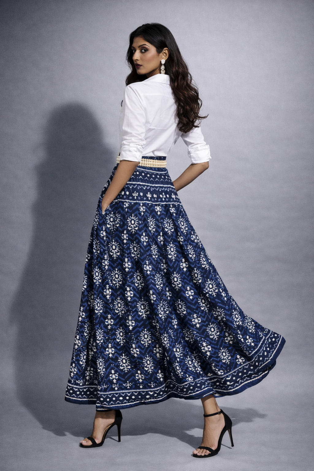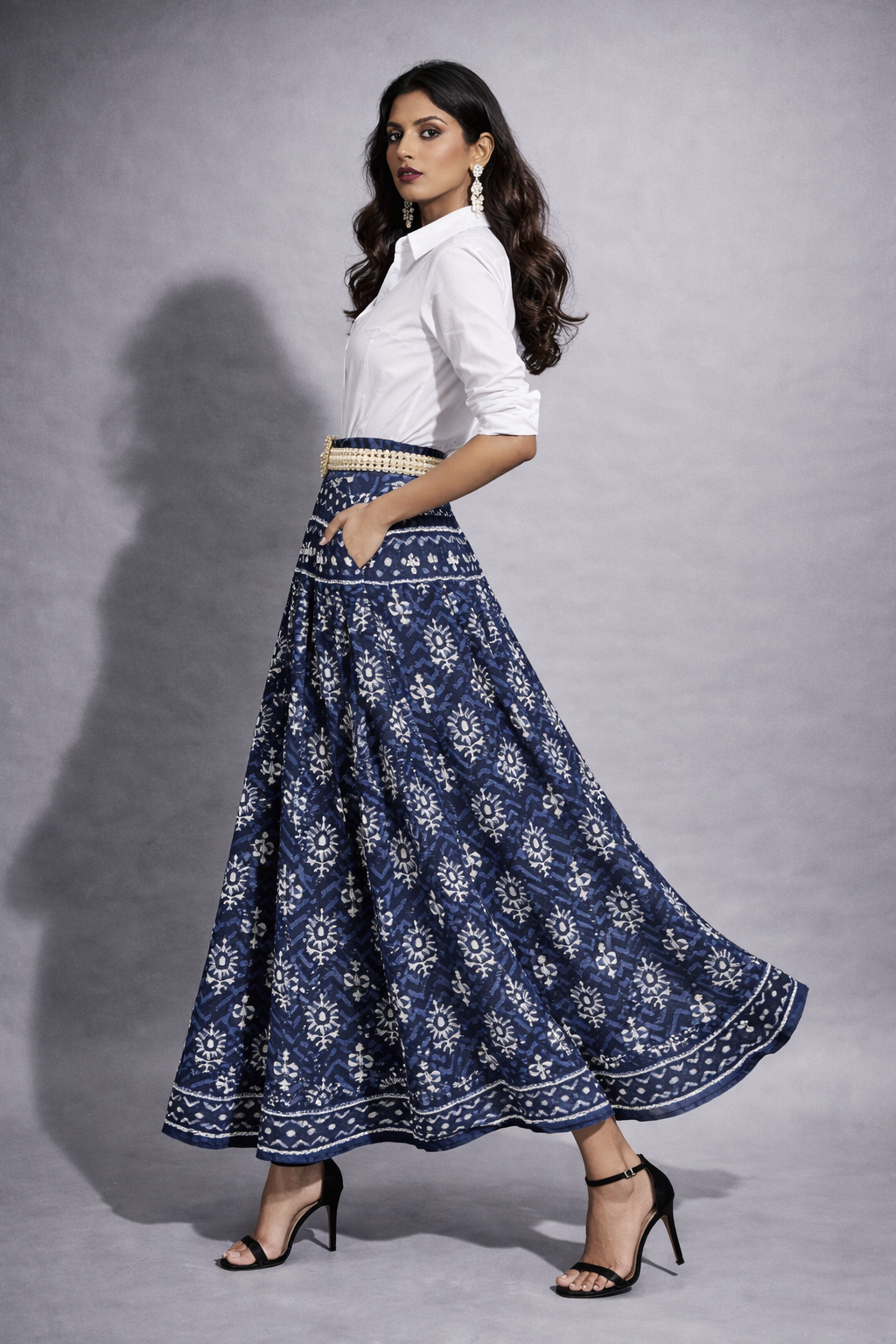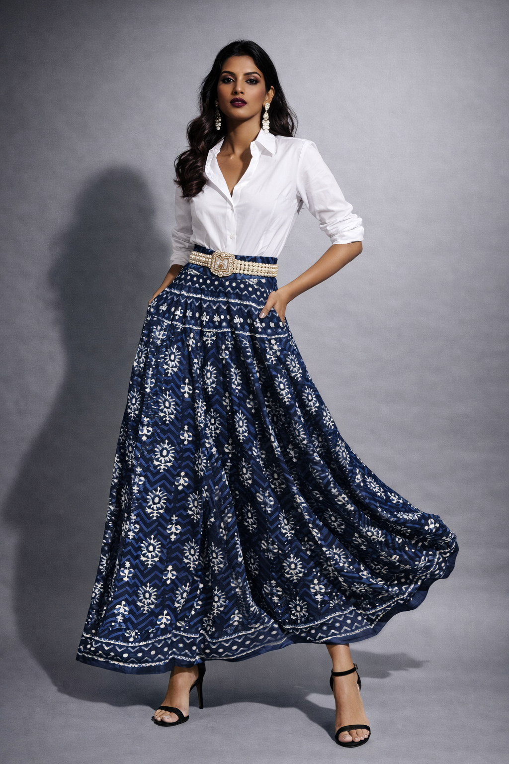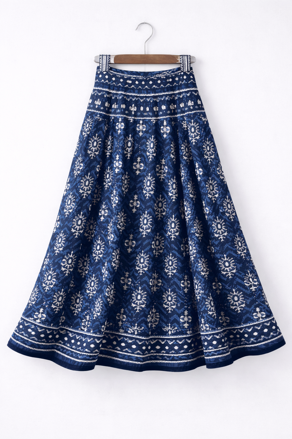 Graceful and timeless, this Indigo Heritage Flared Skirt features traditional ethnic-inspired motifs that bring a perfect blend of elegance and comfort. Designed with a flattering high waist and rich flare, it creates a graceful silhouette suitable for both festive and casual occasions.