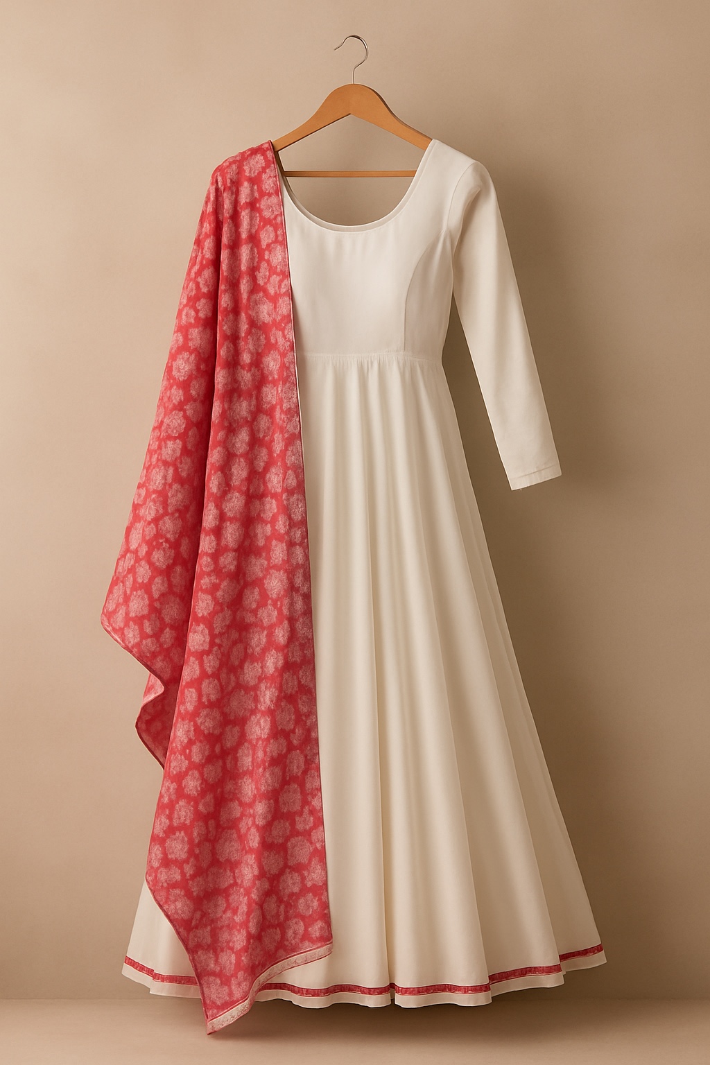 Elegant and graceful, this ivory Anarkali kurta set features a flared silhouette with a classic scoop neckline and full sleeves. It comes paired with a contrasting red printed dupatta, adding a pop of color and ethnic charm to the ensemble.