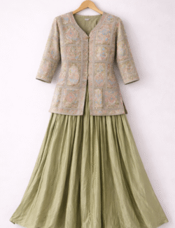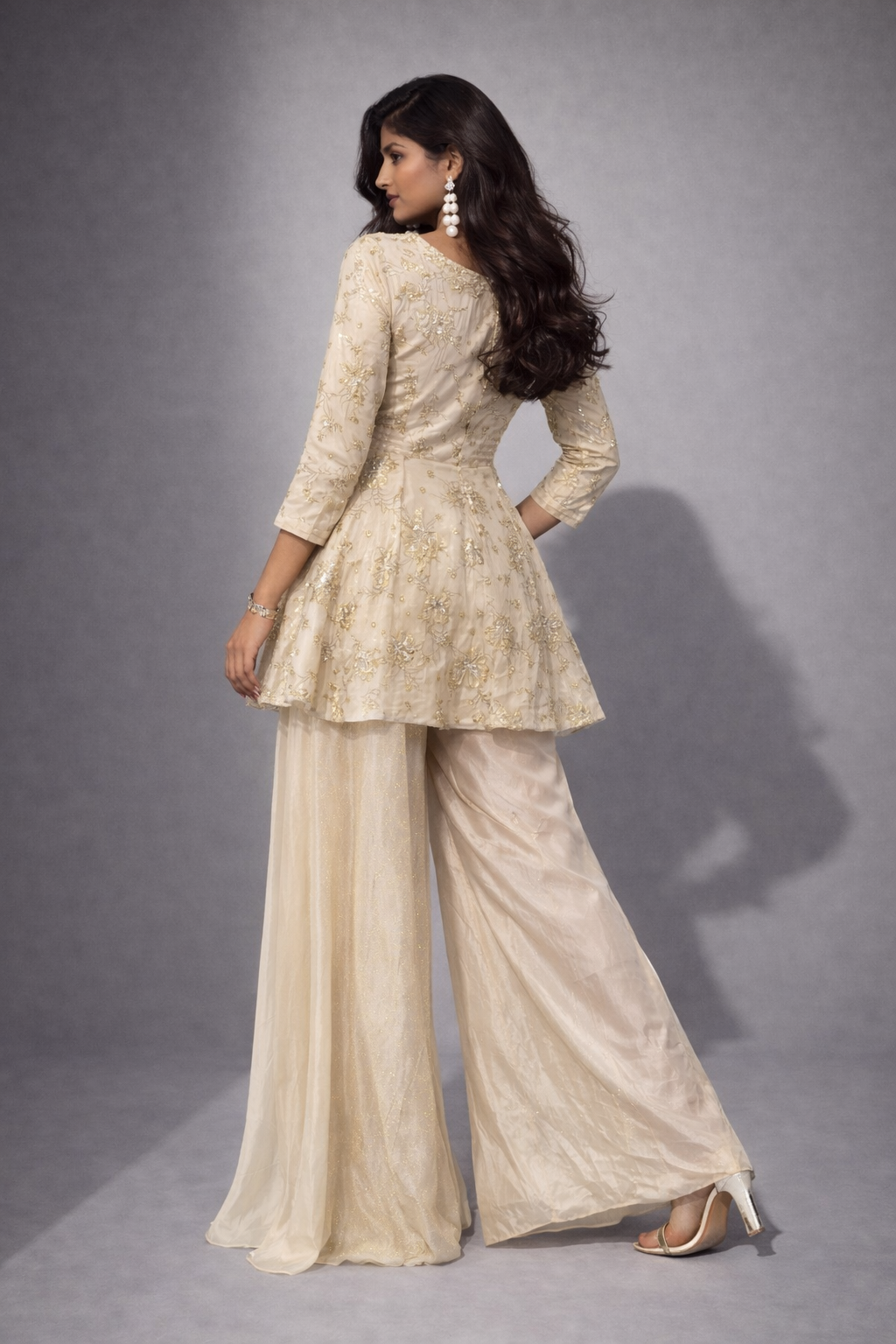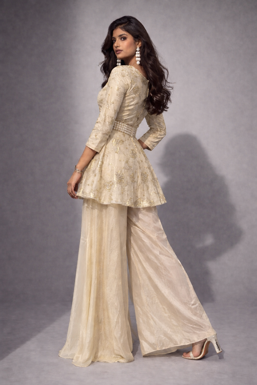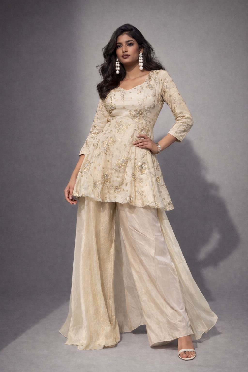 An elegant and graceful ethnic ensemble featuring a beautifully embroidered peplum-style kurta paired with flowy palazzo pants. Designed to give a modern yet traditional look, this outfit reflects subtle luxury and timeless charm, perfect for festive and special occasions