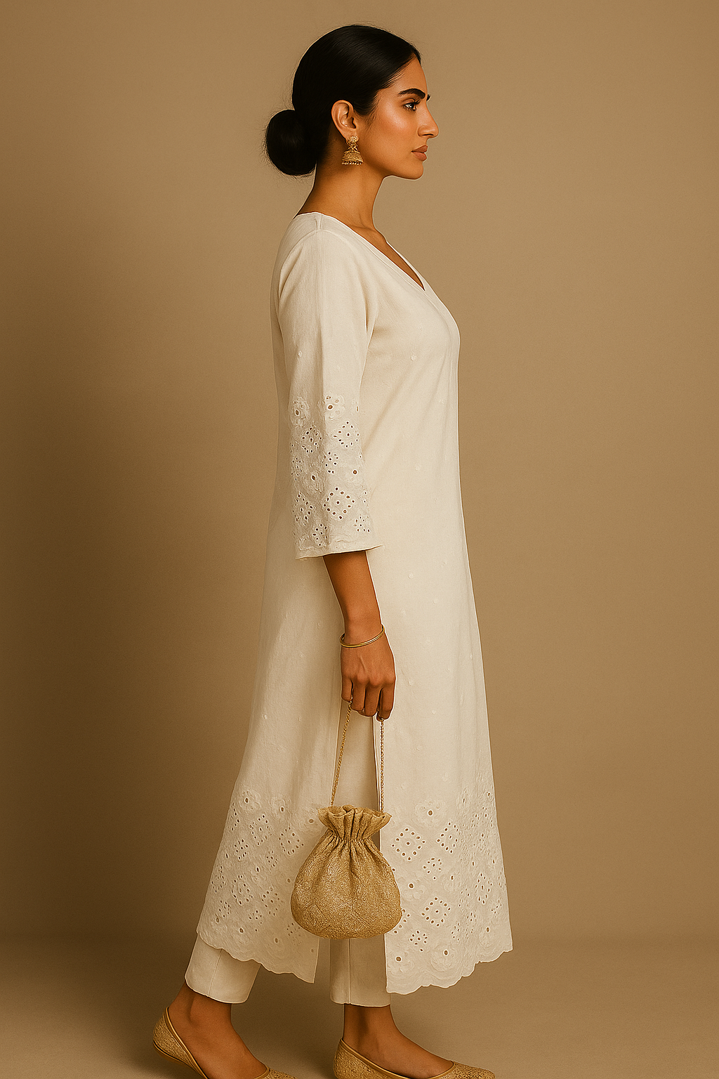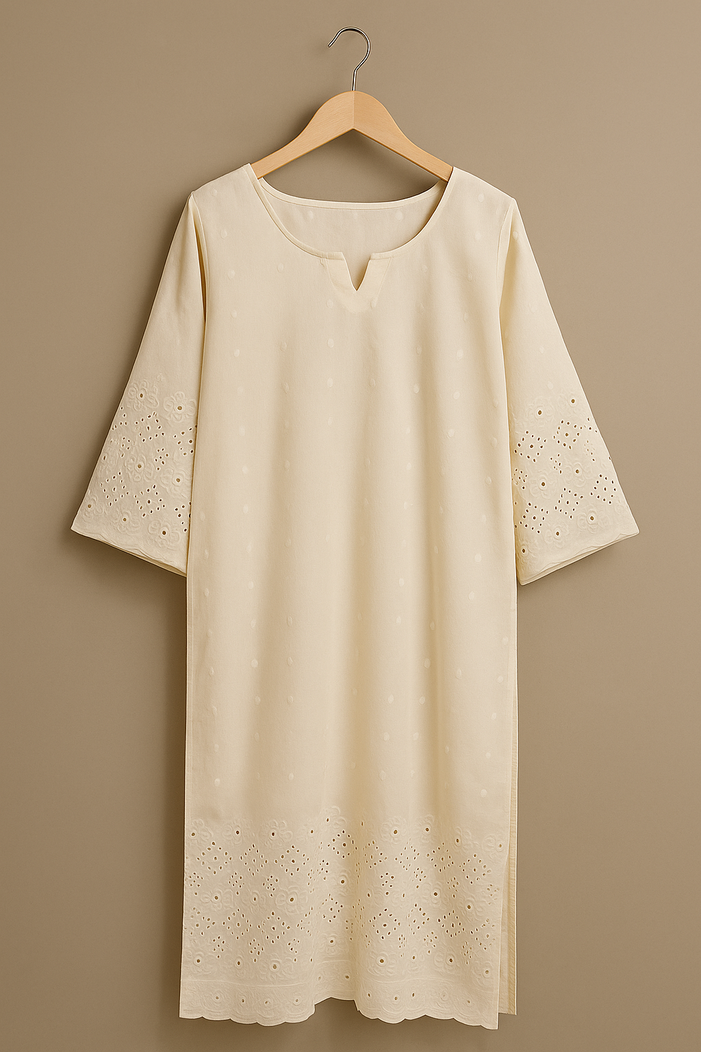 An elegant off-white kurti featuring intricate chikankari embroidery on the sleeves and hemline, designed to blend traditional craftsmanship with contemporary simplicity.
