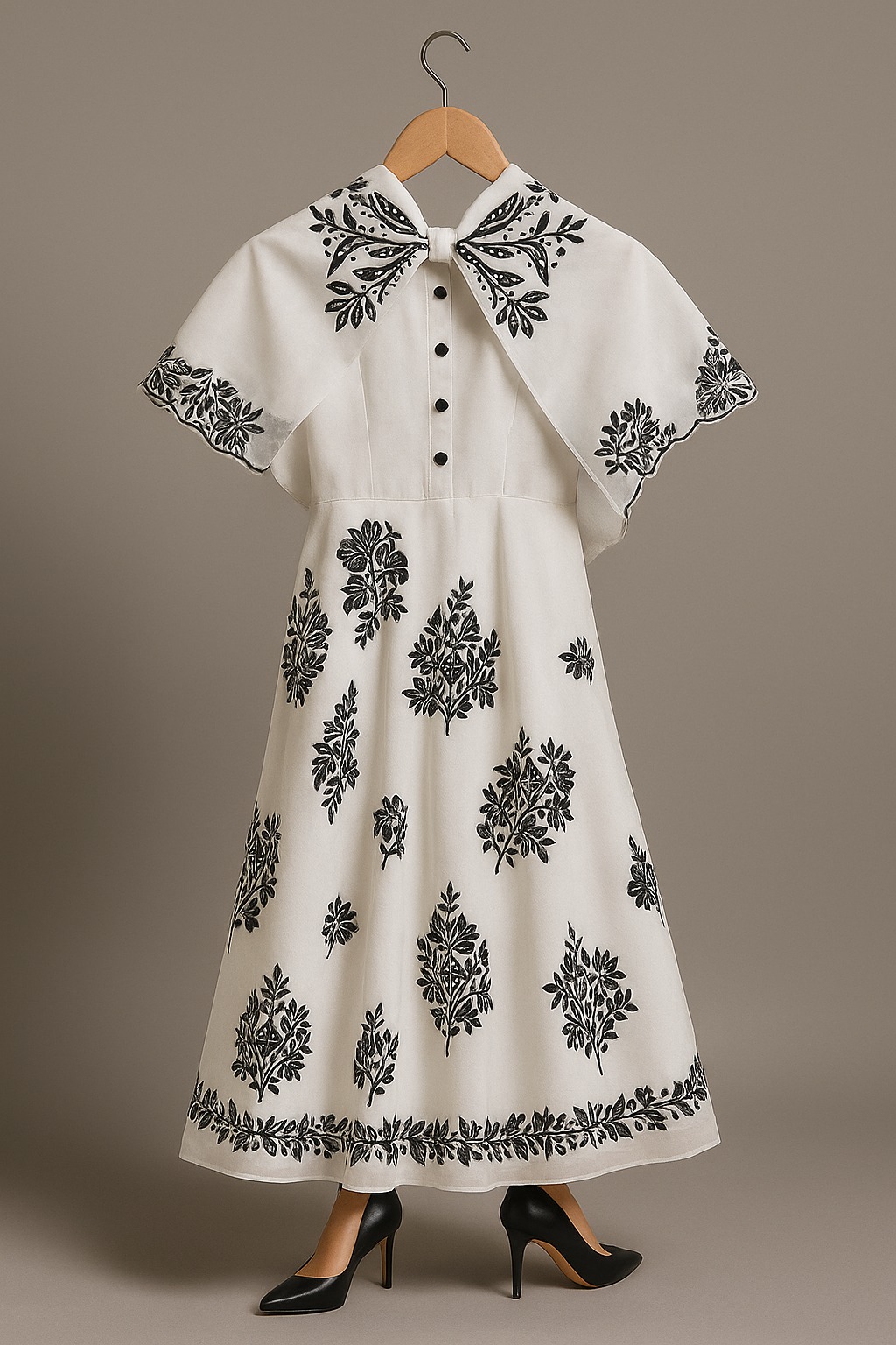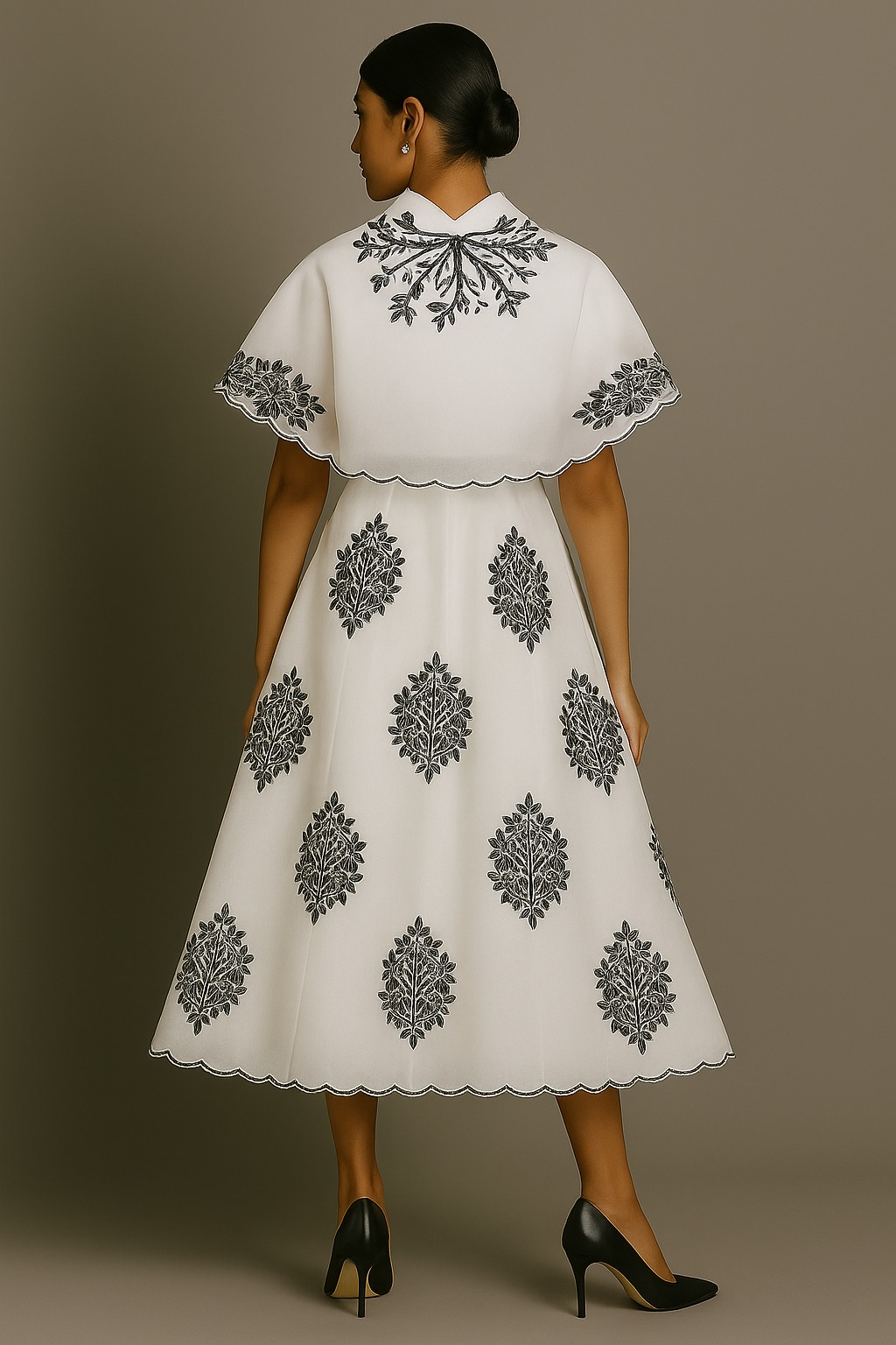 An elegant ivory midi dress adorned with black floral hand painting throughout, featuring a detachable capelet with matching embroidery. The scalloped hemline and sleeves add a refined, feminine touch, while the structured silhouette provides a timeless charm. Ideal for upscale occasions, this dress balances Hand Painting with modern tailoring.