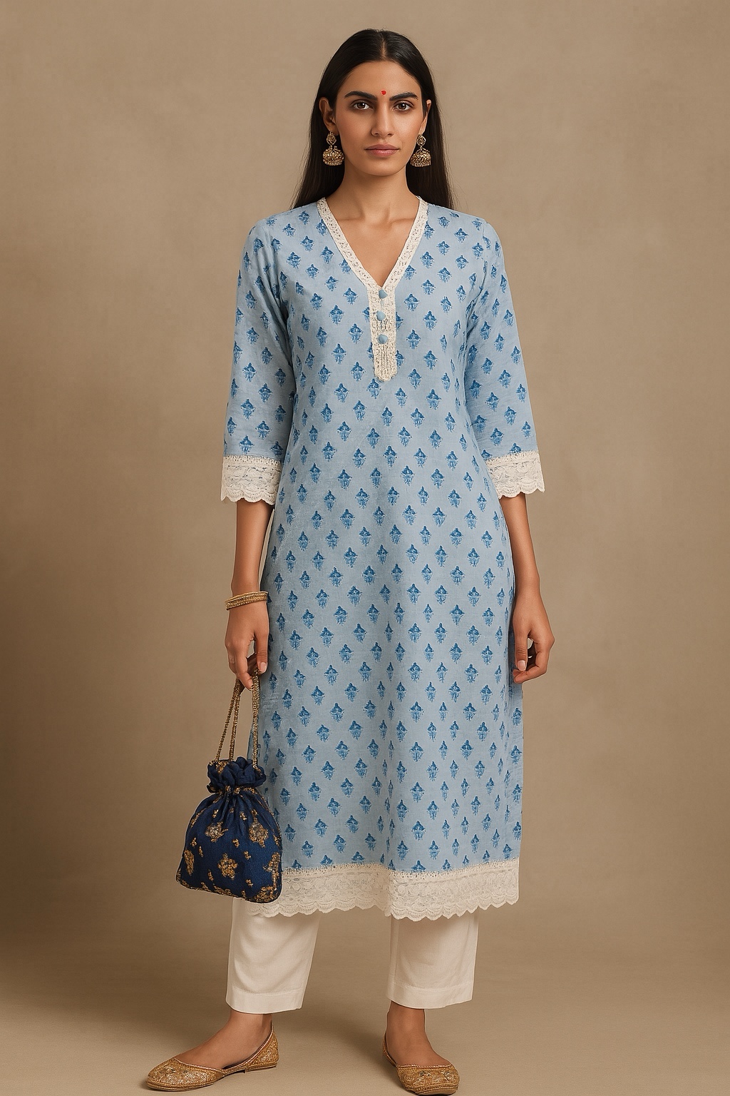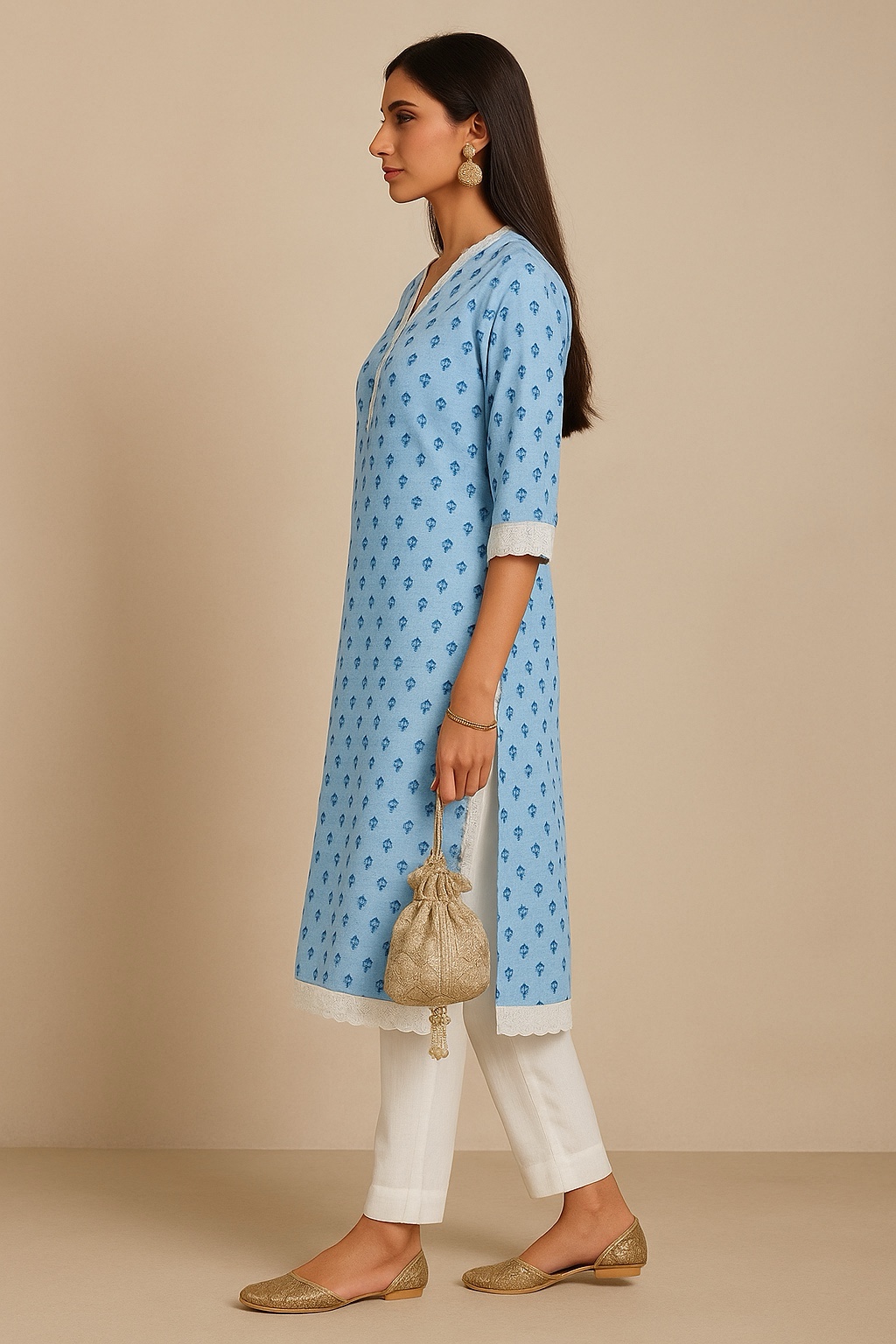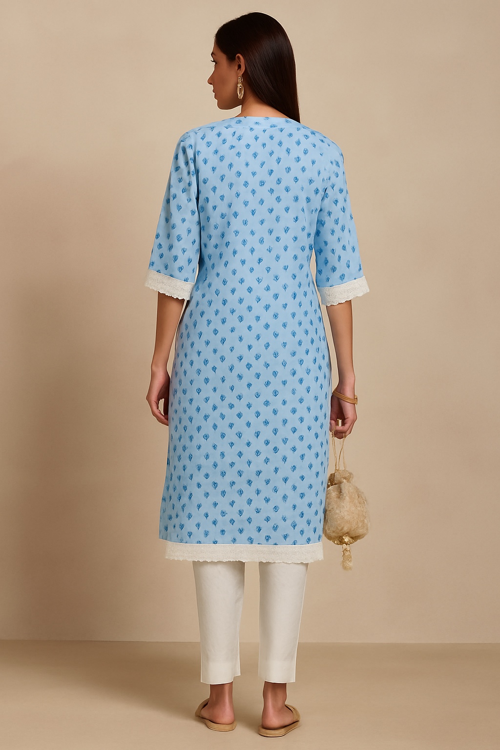 Light Blue Floral Cotton Kurti with Lace Detailing