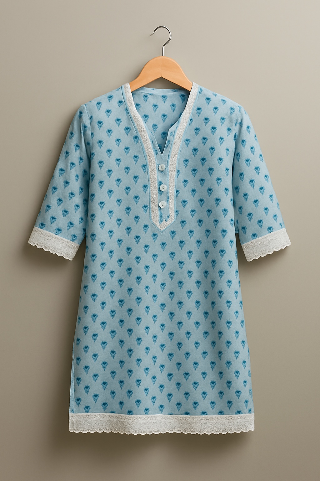 AÂ soft and comfortable everyday cotton kurti featuring an all-over miniature floral motif, enhanced with delicate lace borders on the neckline, sleeves, and hemline. Ideal for relaxed days, casual wear, or home lounging.