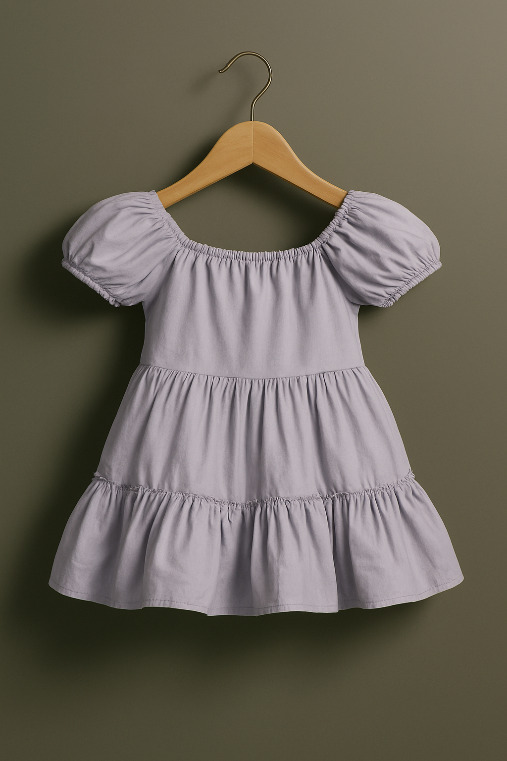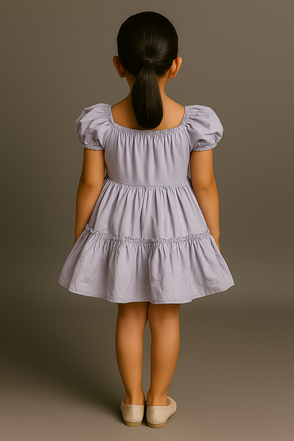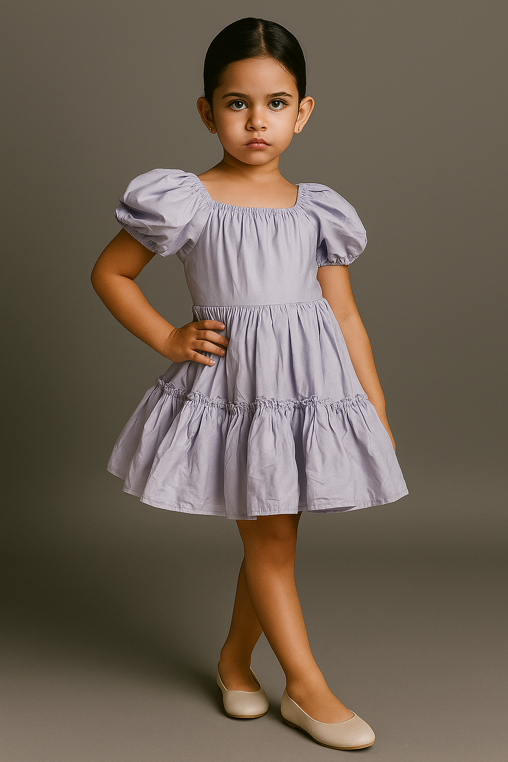 A soft, elegant lavender dress designed with puffed sleeves and a tiered silhouette. Its off-shoulder neckline and gathered tiers give it a dreamy, voluminous look, making it both playful and graceful for young girls.