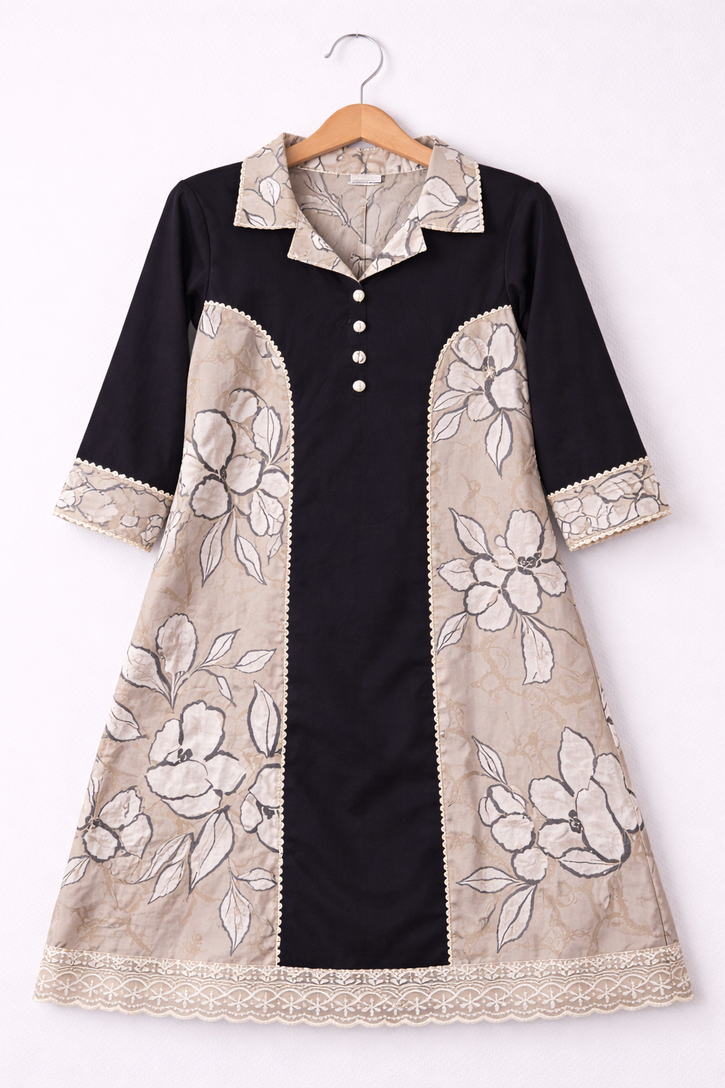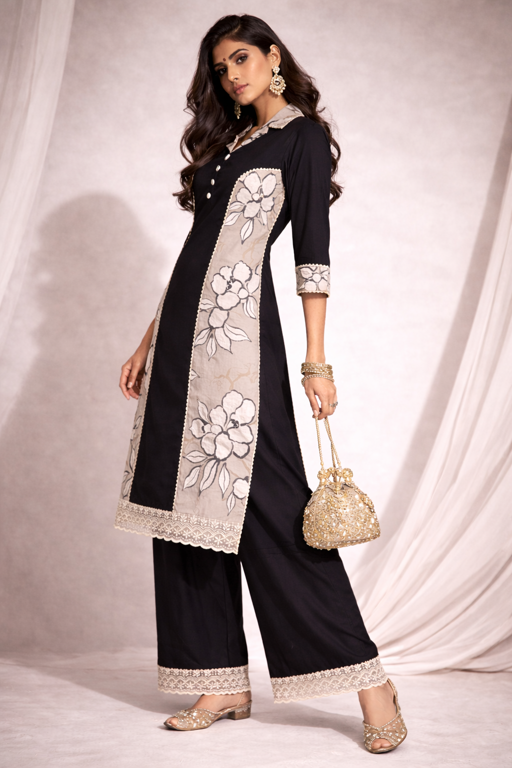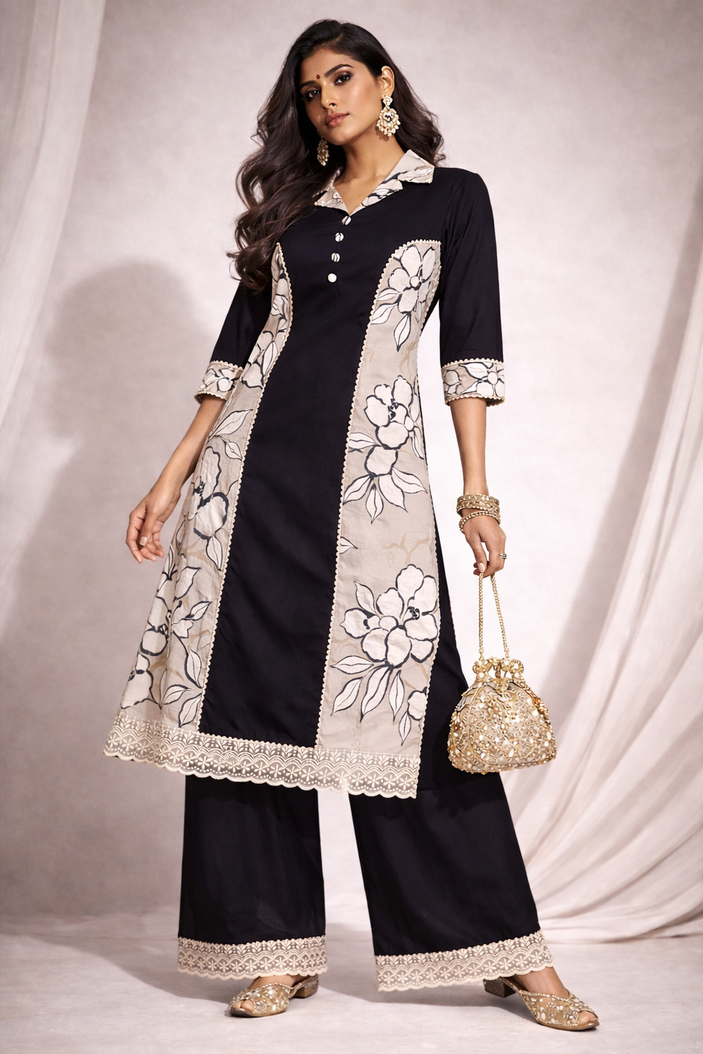A sophisticated kurti crafted with a striking contrast of solid black and soft floral prints. Designed with a structured silhouette and delicate lace detailing, this kurti blends modern tailoring with timeless Indian aesthetics. Perfect for women who appreciate understated elegance with a contemporary touch